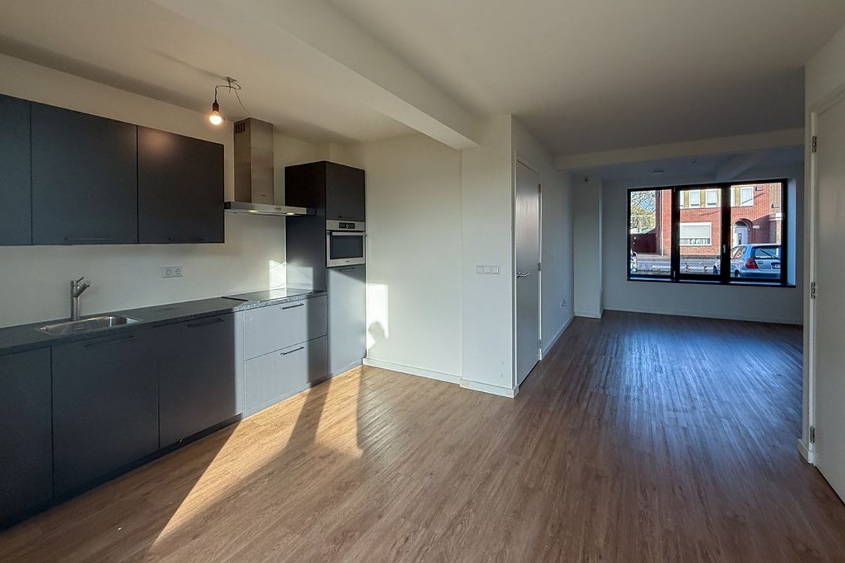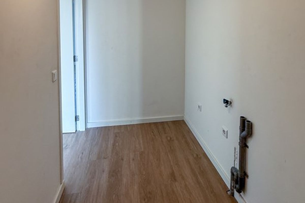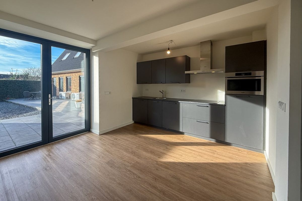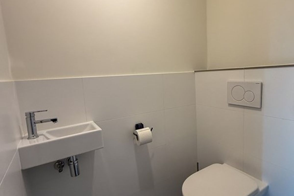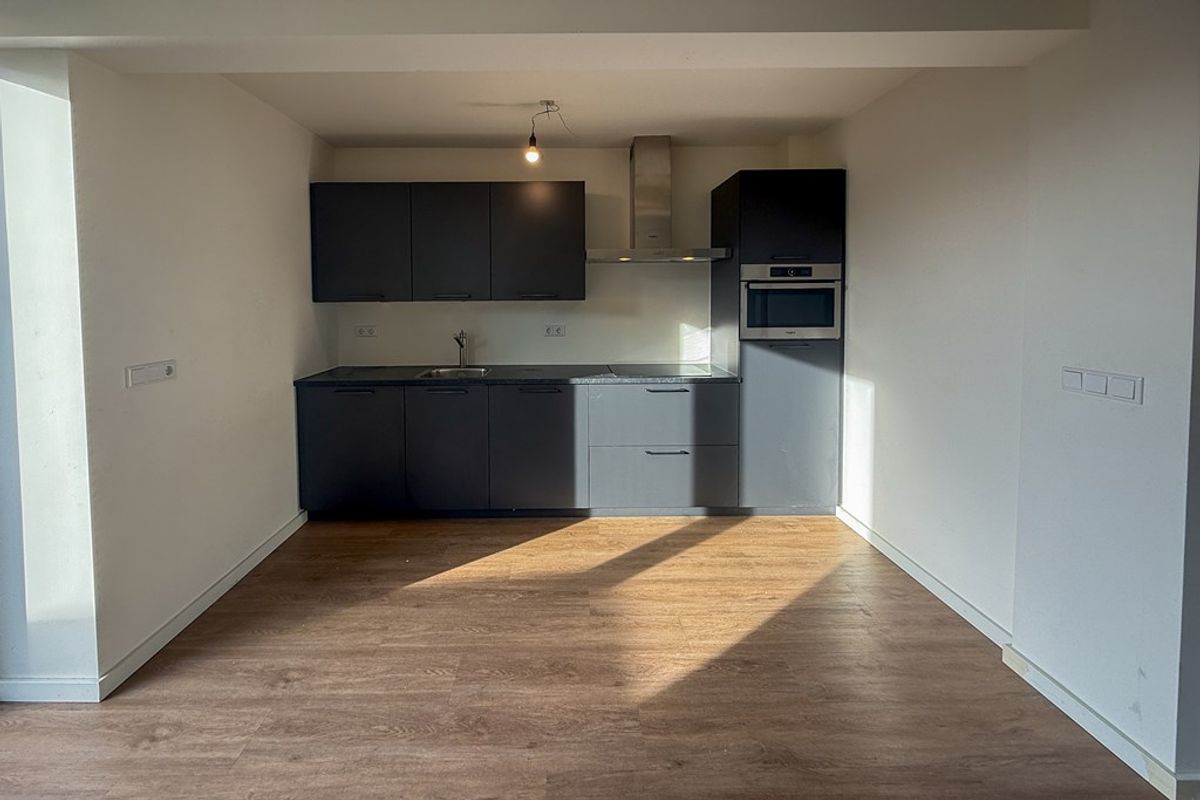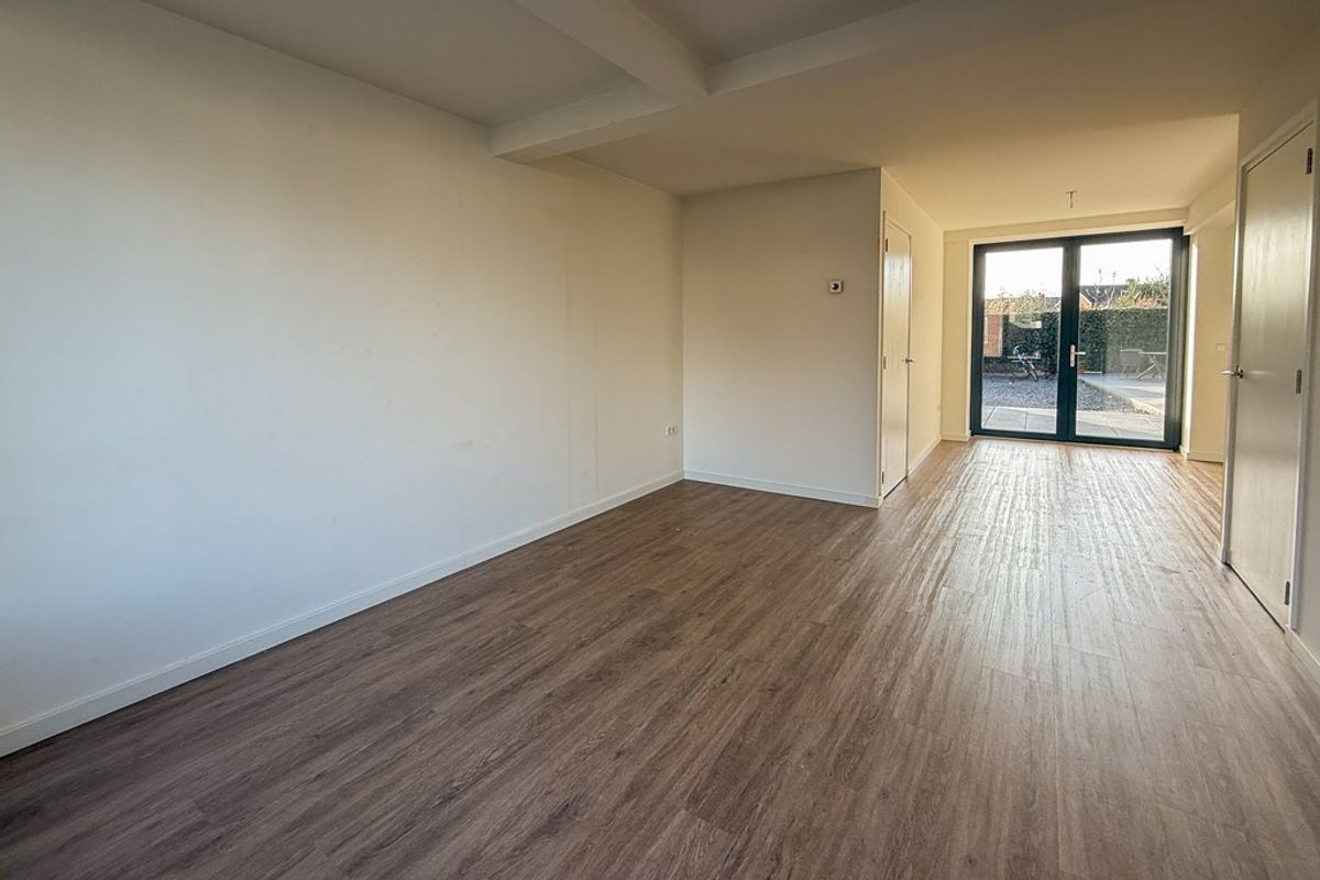 Hal (5 m²) en toegang tot het moderne zwevende toilet met fonteintje. De woonkamer met open keuken (ca. 30 m²) is afgewerkt met een moderne laminaatvloer en voorzien van een strakke keukenopstelling met inductiekookplaat, afzuigkap, combimagnetron, koelkast en vaatwasser.