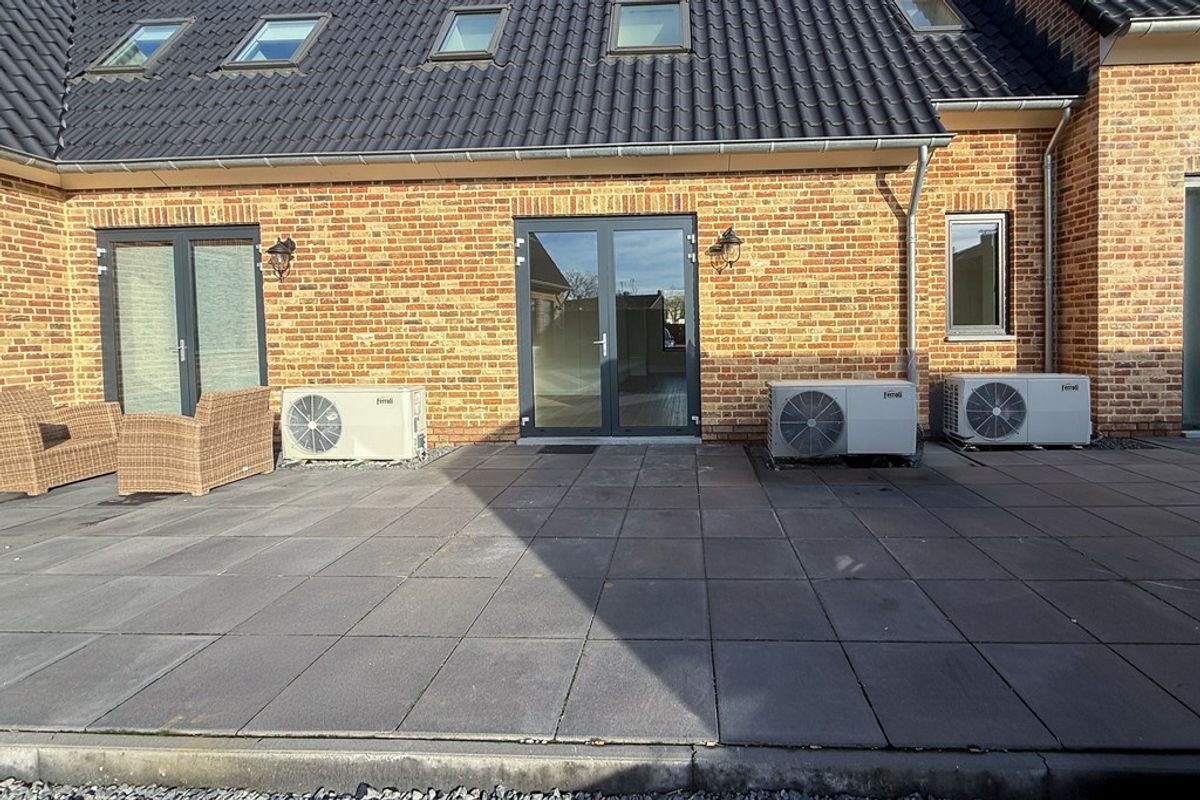 Aansluitend bevindt zich de bijkeuken (ca. 5 m²) met opstelling van de warmtepomp en aansluiting voor de wasmachine. Vanuit de keuken is het terras aan de achterzijde bereikbaar, met een oppervlakte van circa 19 m².