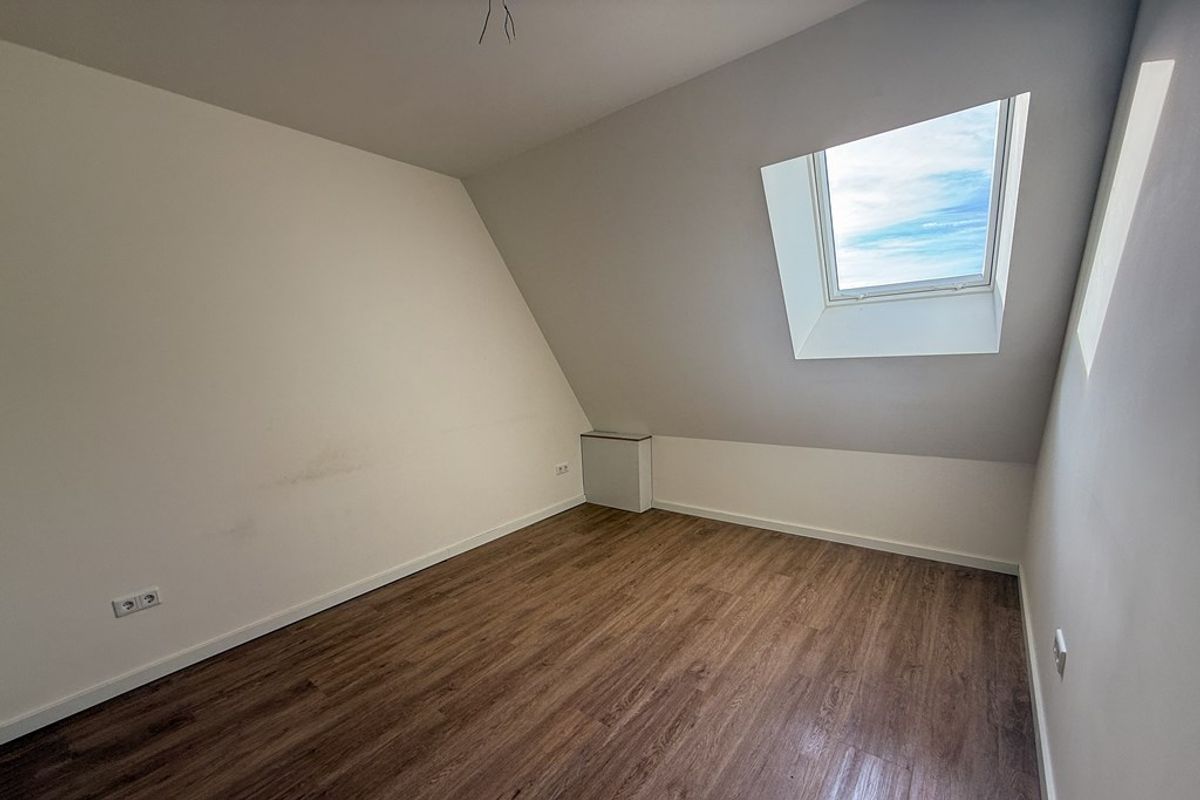 Overloop met toegang tot twee ruime slaapkamers (ca. 17 m² en 13 m²). De moderne badkamer (ca. 7 m²) is uitgevoerd met een inloopdouche, wastafel met meubel en een zwevend toilet. Ook deze verdieping is afgewerkt met een doorlopende laminaatvloer.