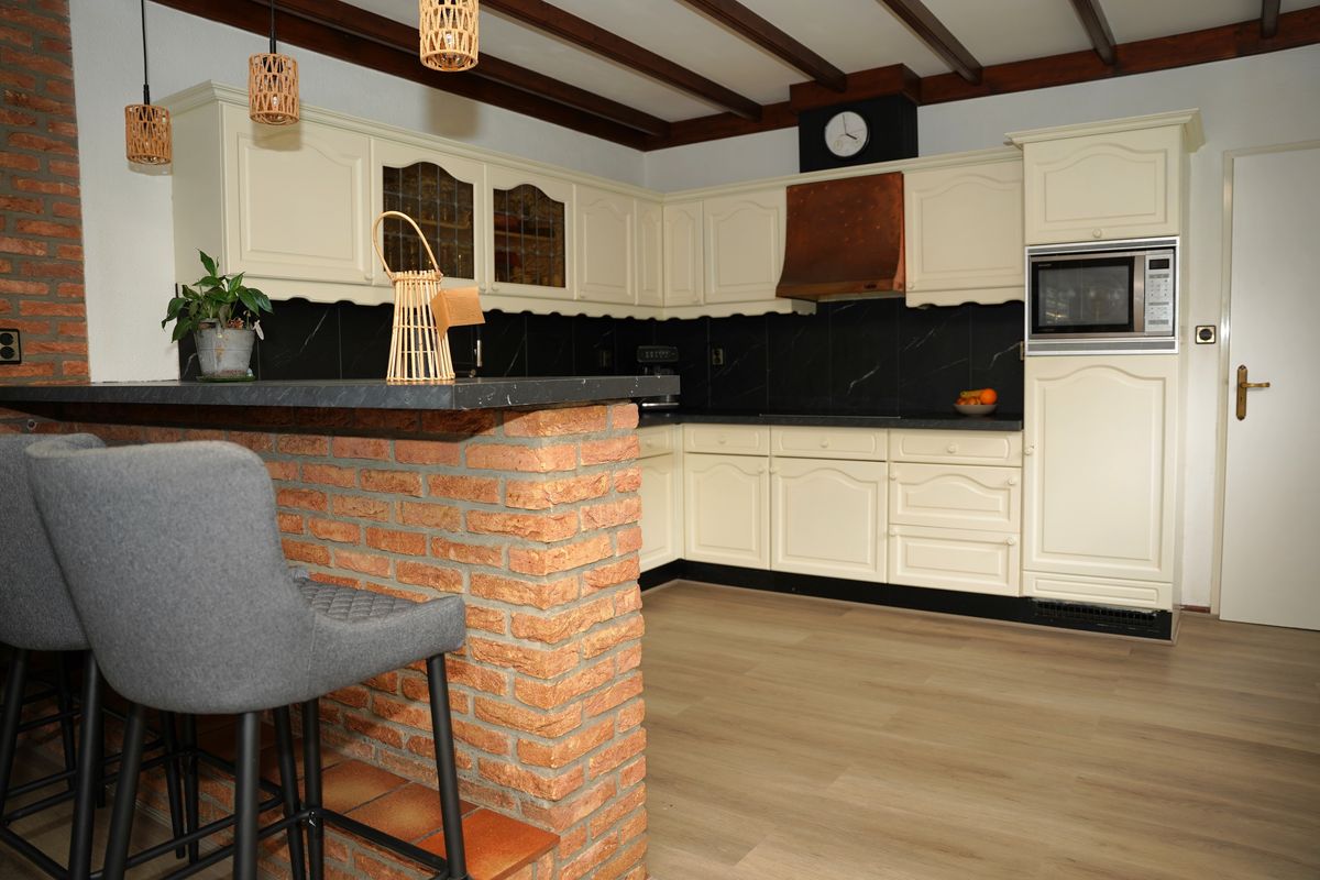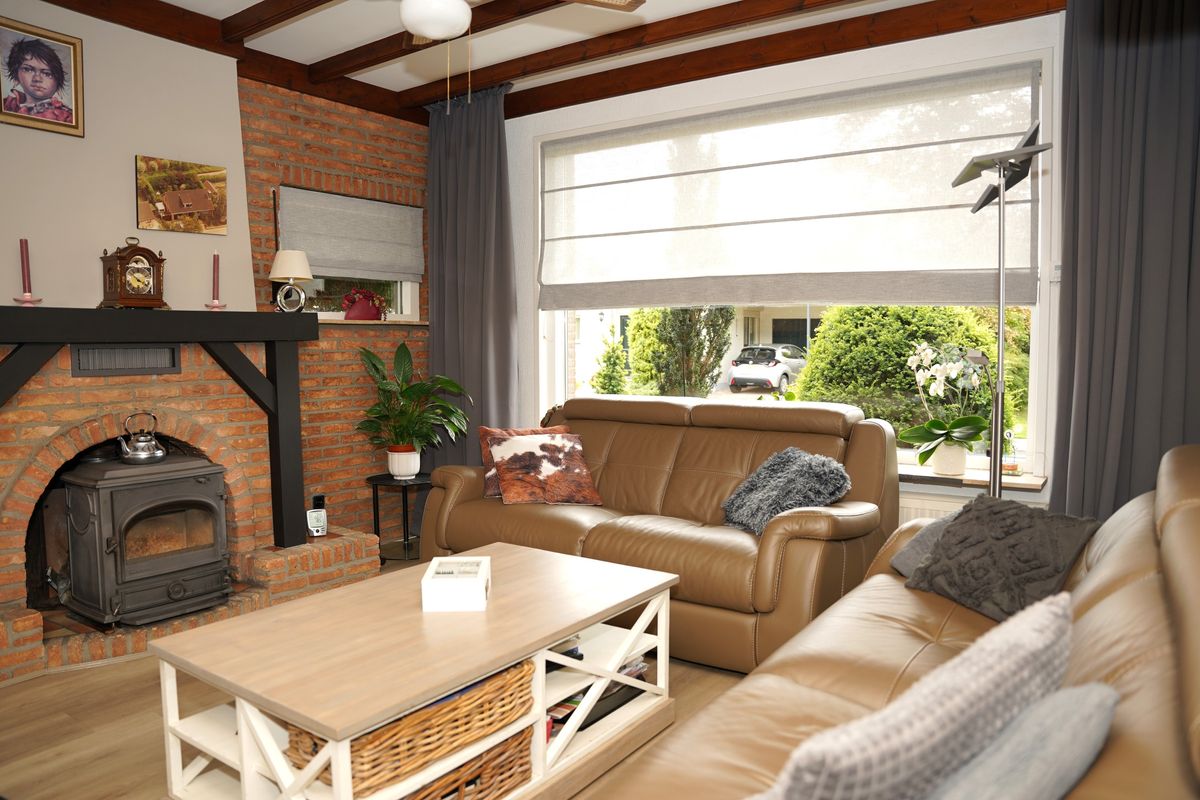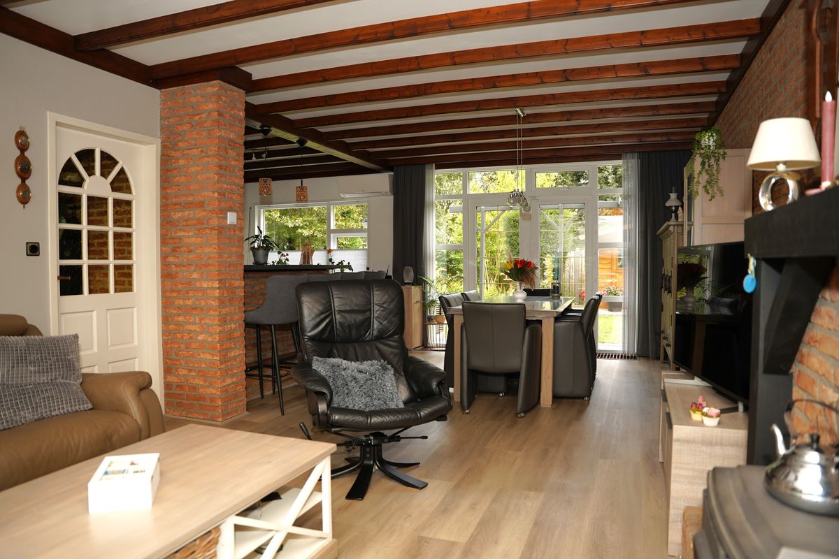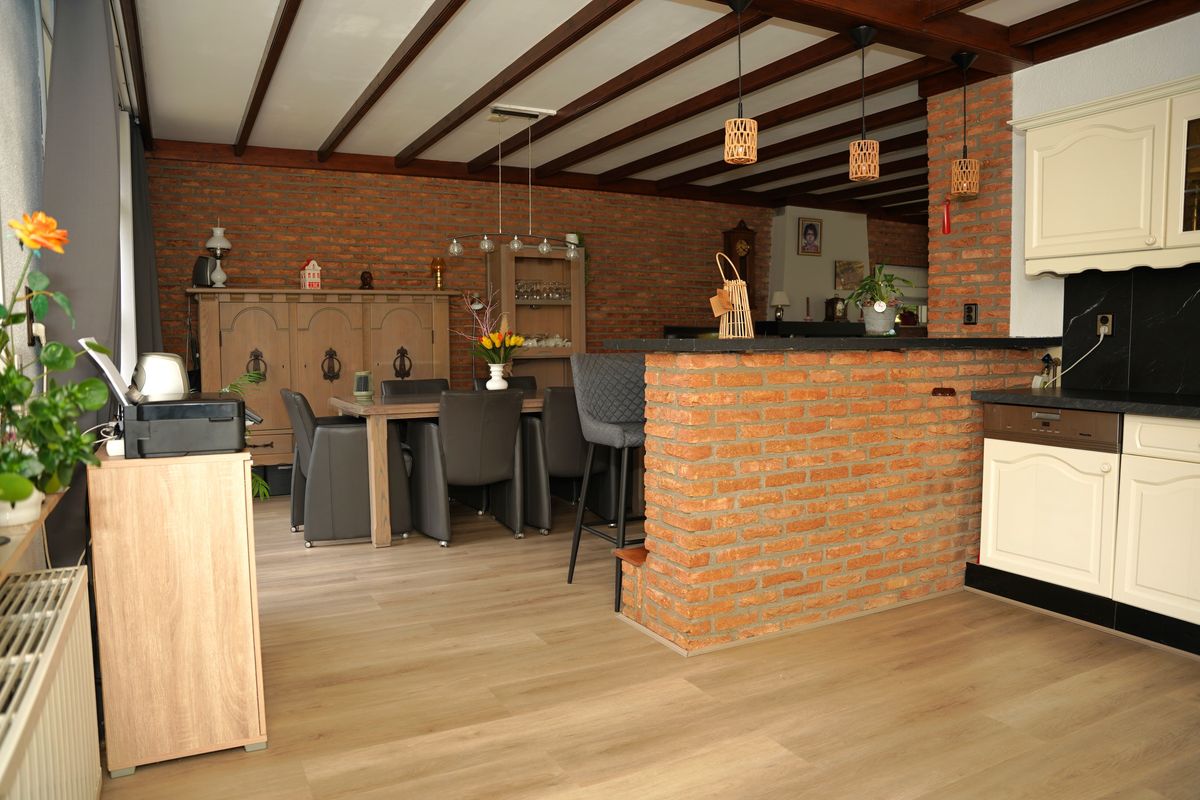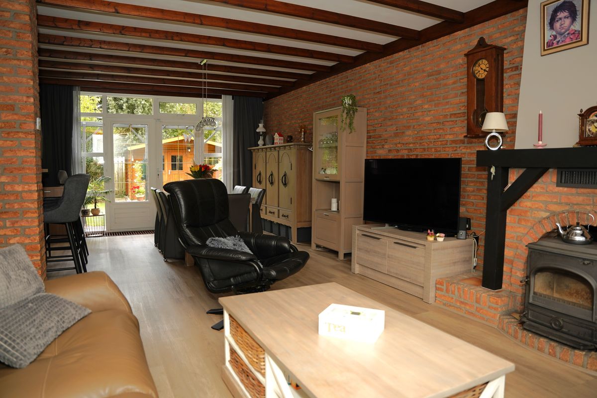 De woonkamer en de keuken zijn voorzien van een moderne pvc vloer, een gezellige houtkachel en openslaande tuindeuren naar het terras. De balken in het plafond zijn decoratief en geven extra karakter aan de ruimte.