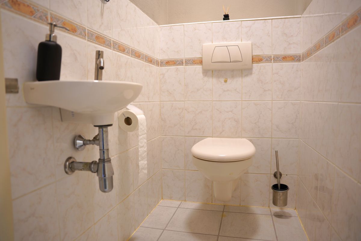 Je komt binnen in de nette, ruime hal met meterkast, toilet en de trap naar de 1e etage.