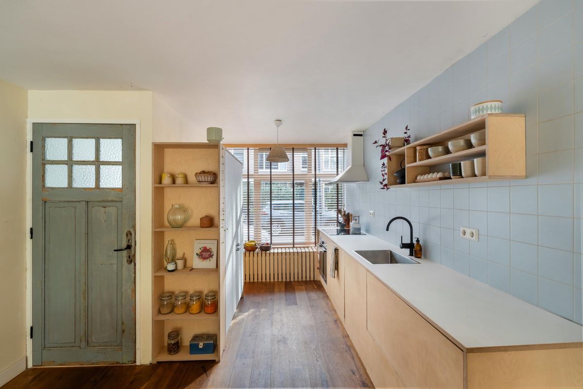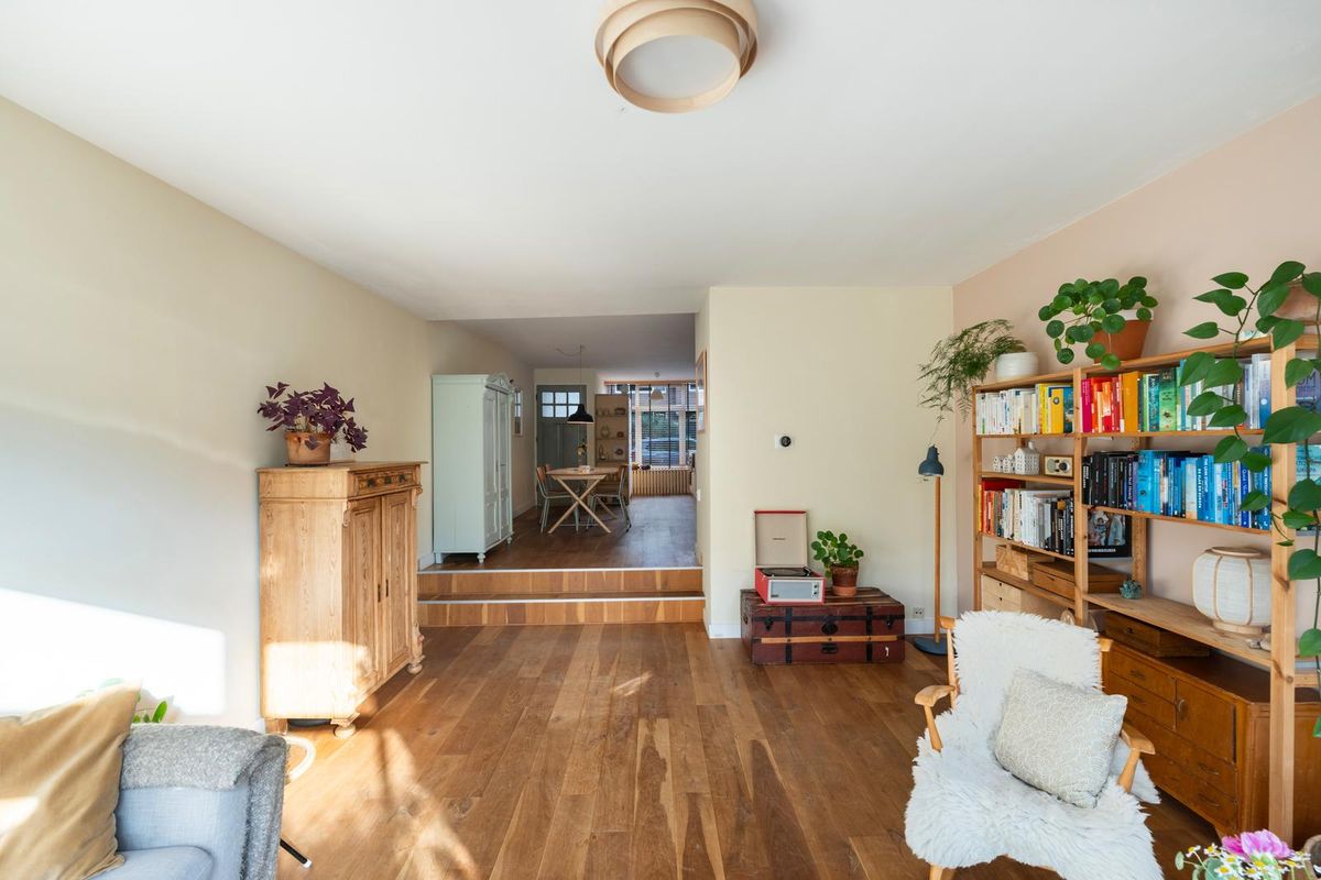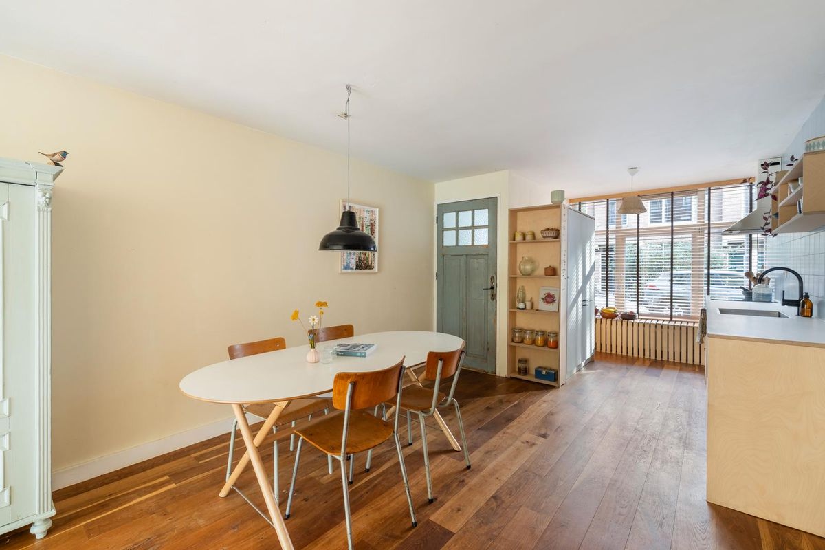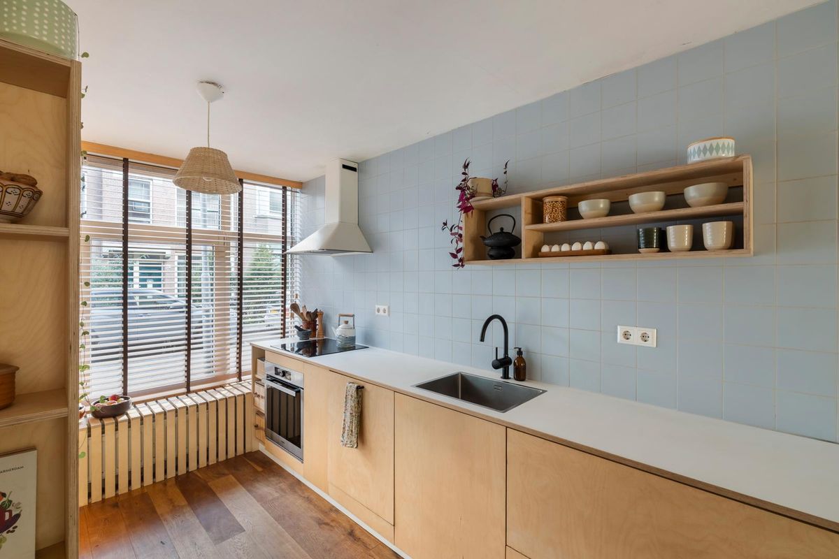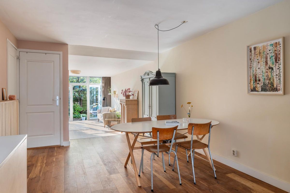 Entree met tochtportaal en toegang tot alle vertrekken. Bij binnenkomst ervaar je de ruimtelijke indeling, waarbij het gebruik van hout zorgt voor een natuurlijke en aangename sfeer. De eetkamer met vaste kasten (wasmachine-aansluiting) bevindt zich aan de voorzijde van de woning. De open keuken beschikt over diverse inbouwapparatuur, zoals een 4-pits elektrische kookplaat met afzuigkap, oven, vaatwasser en een koel-/vriescombinatie. Deze open woonkeuken is een plek waar koken en gezelligheid perfect samenkomen. Het is de ideale plek om lekker in contact te blijven met je gezelschap, terwijl je geniet van de open, gezellige sfeer. Doordat er een verhoging in de kamer is gecreëerd, ontstaat er een speels effect in de ruimte. Via deze trap bereik je het woongedeelte, gelegen aan de achterzijde van de woning. De riante ruimte biedt vele mogelijkheden voor het creëren van een sfeervolle en comfortabele zithoek. Het woongedeelte staat in directe verbinding met de royale achtertuin van 32 m2. Dankzij de openslaande deuren valt het daglicht mooi binnen en ontstaat er een natuurlijke verbinding tussen binnen en buiten. In de tuin is meer dan voldoende ruimte om lekker op een zomerse avond te dineren en lang te tafelen.
