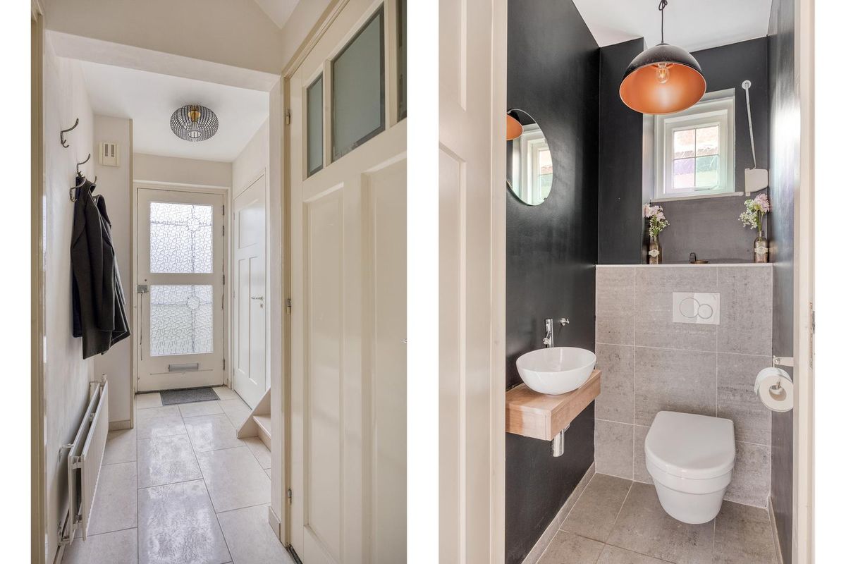 Het toilet is afgewerkt met tegels (met vloerverwarming) deels tegels, deels stucwerk als wandafwerking en een stucwerk plafond. Het toilet is voorzien van een hangend closet en een fonteintje.
