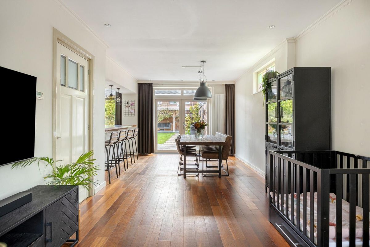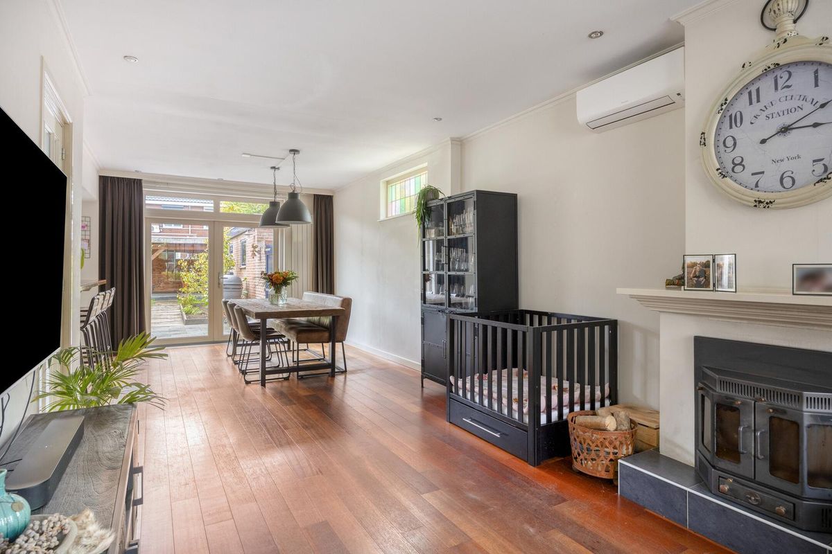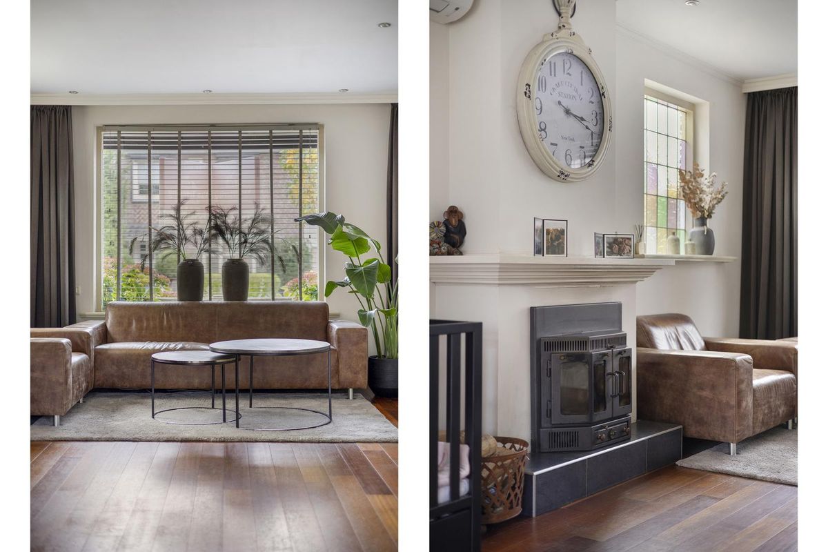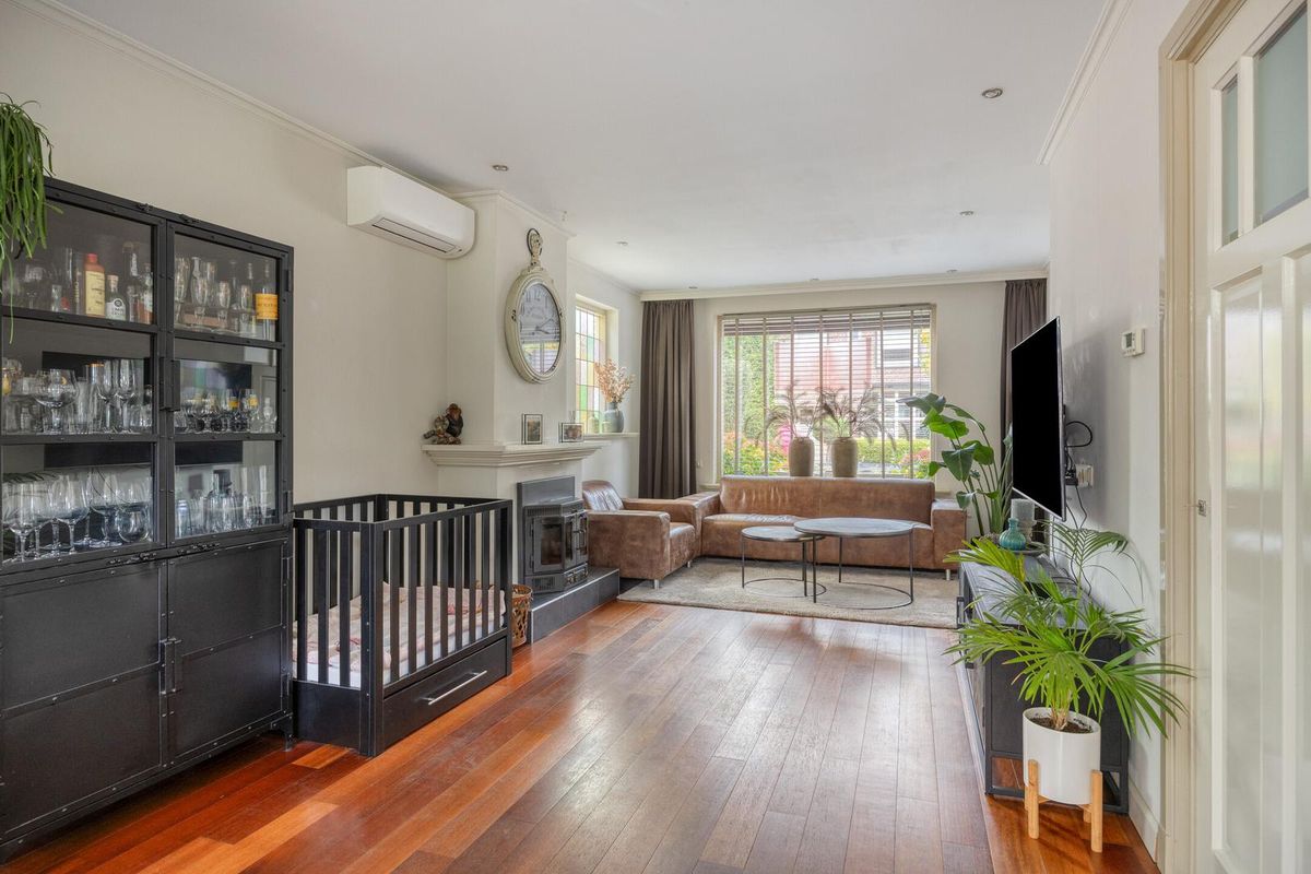 De woonkamer is afgewerkt met een houten vloer (eiken lamelparket) en stucwerk als wand- en plafondafwerking. De woonkamer beschikt over een sfeervolle schouw met houtkachel, glas-in-lood ramen, vaste kast en een airco (bouwjaar 2025). Middels de openslaande tuindeuren is de achtertuin bereikbaar.