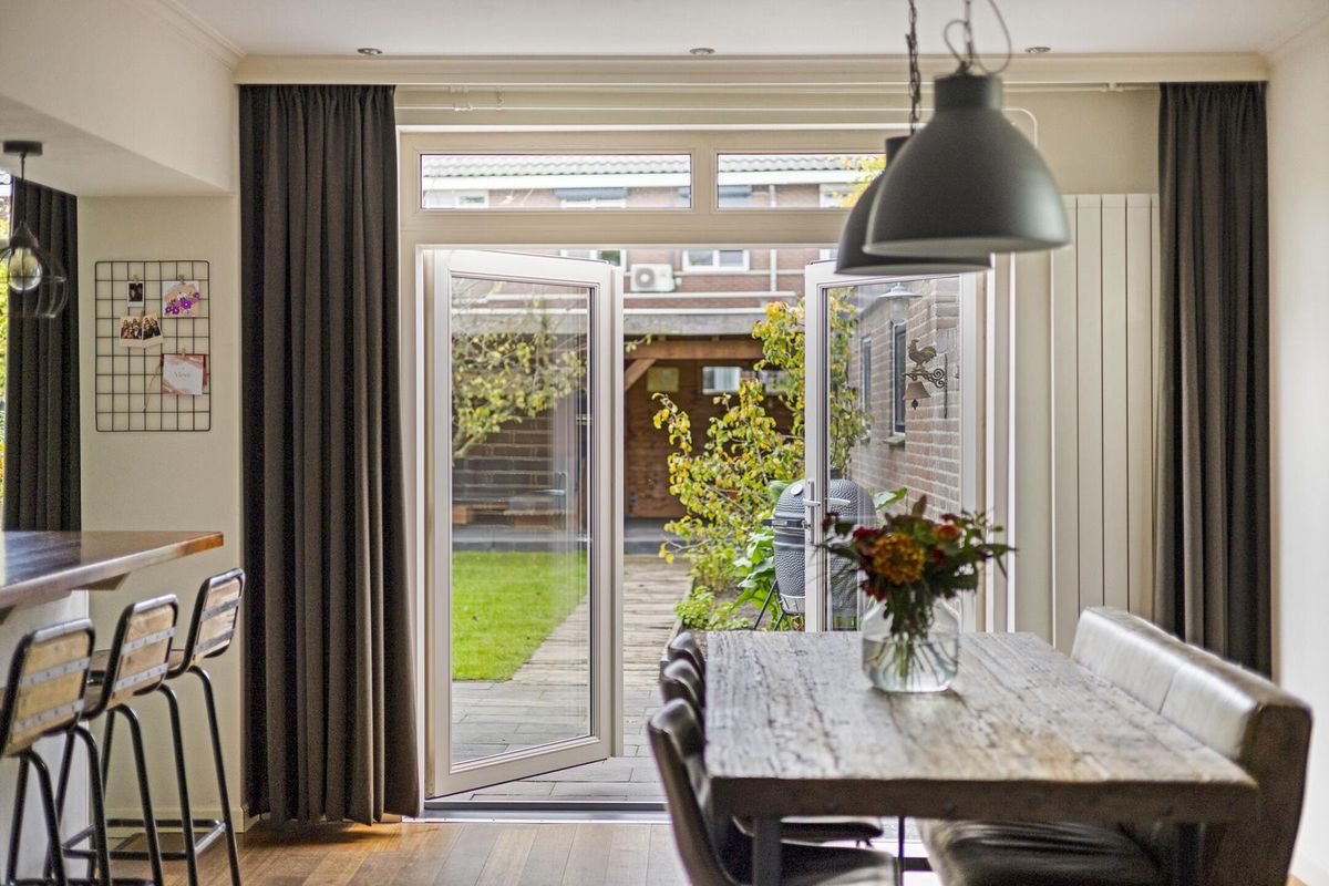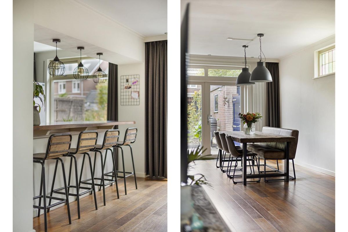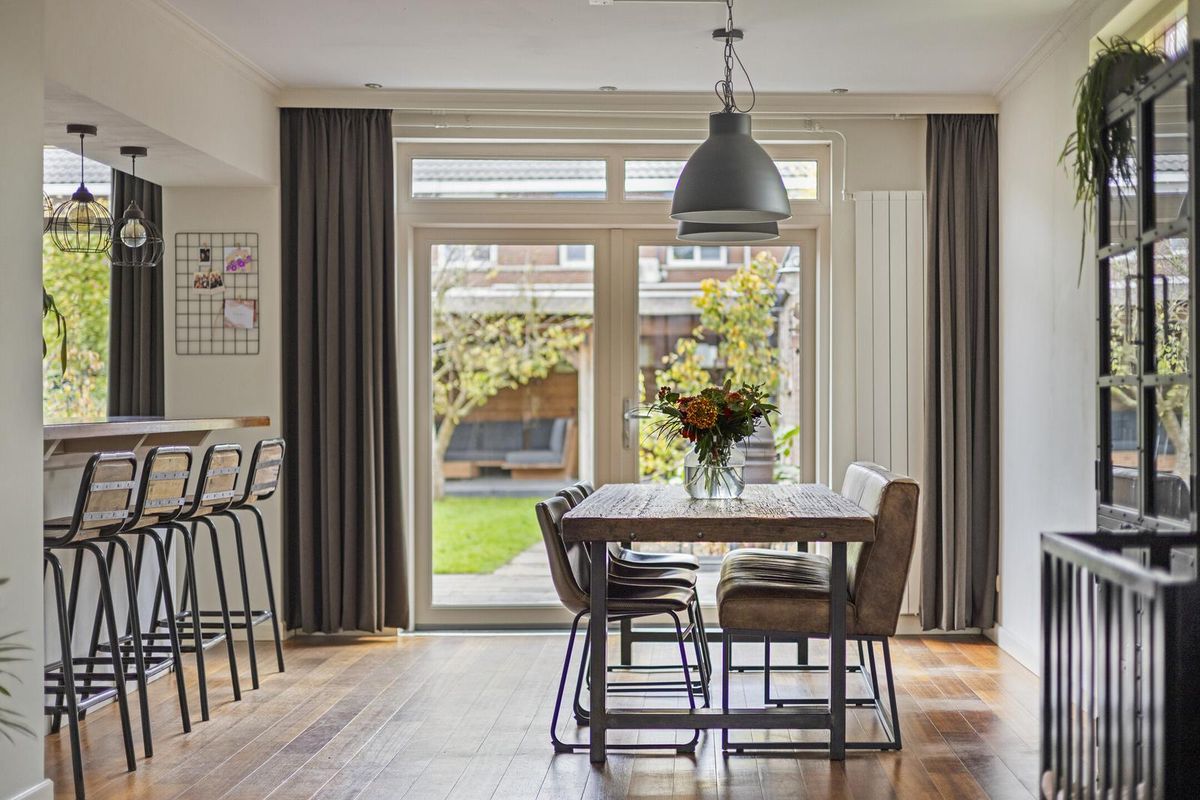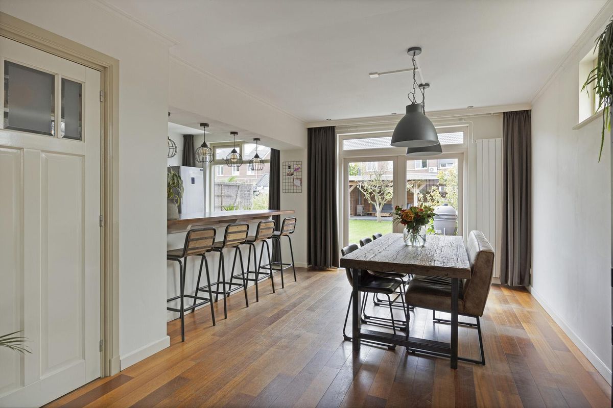 De woonkamer is afgewerkt met een houten vloer (eiken lamelparket) en stucwerk als wand- en plafondafwerking. De woonkamer beschikt over een sfeervolle schouw met houtkachel, glas-in-lood ramen, vaste kast en een airco (bouwjaar 2025). Middels de openslaande tuindeuren is de achtertuin bereikbaar.