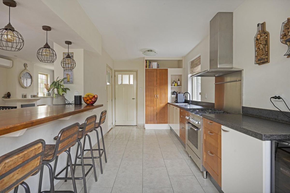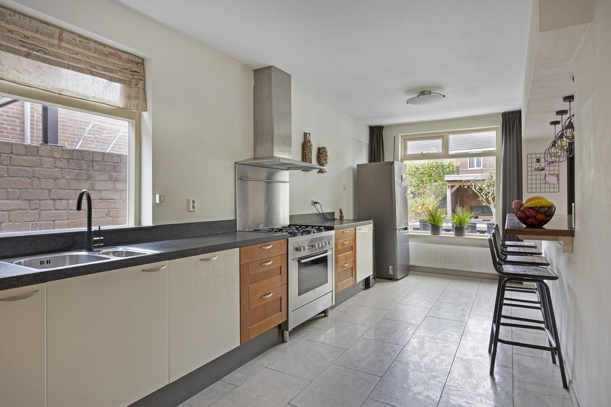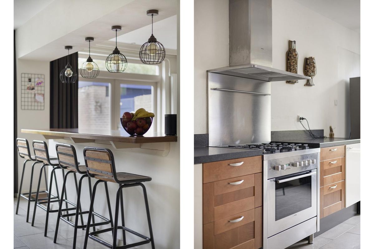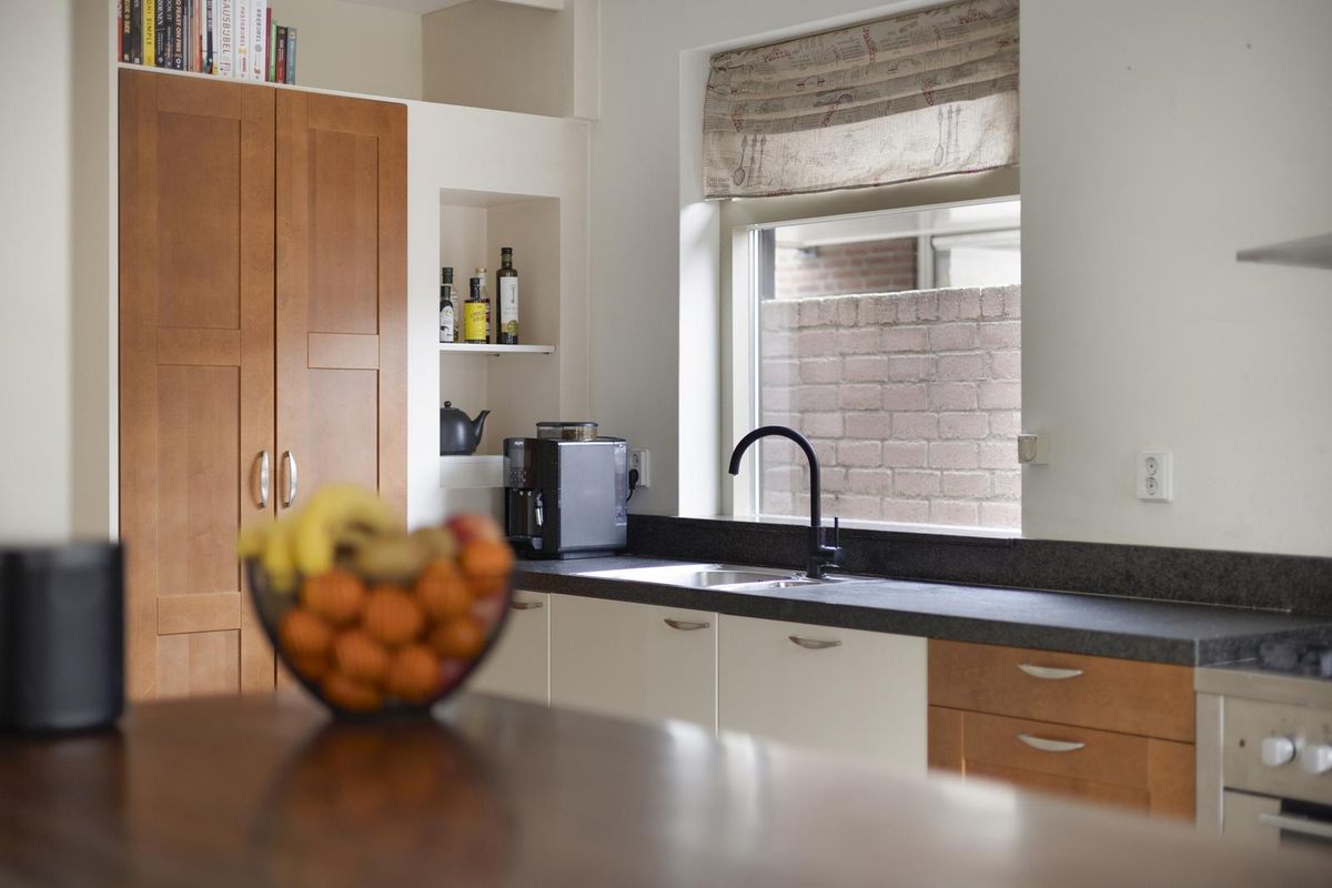 De halfopen keuken met royale bar is afgewerkt met een tegelvloer en stucwerk als wand- en plafond afwerking. De keuken is voorzien van een granieten aanrechtblad, 5-pits gasfornuis met oven, vaatwasser, afzuigkap en een gootsteen. In de vaste kasten bevindt zich de wasmachine- en drogeropstelling.