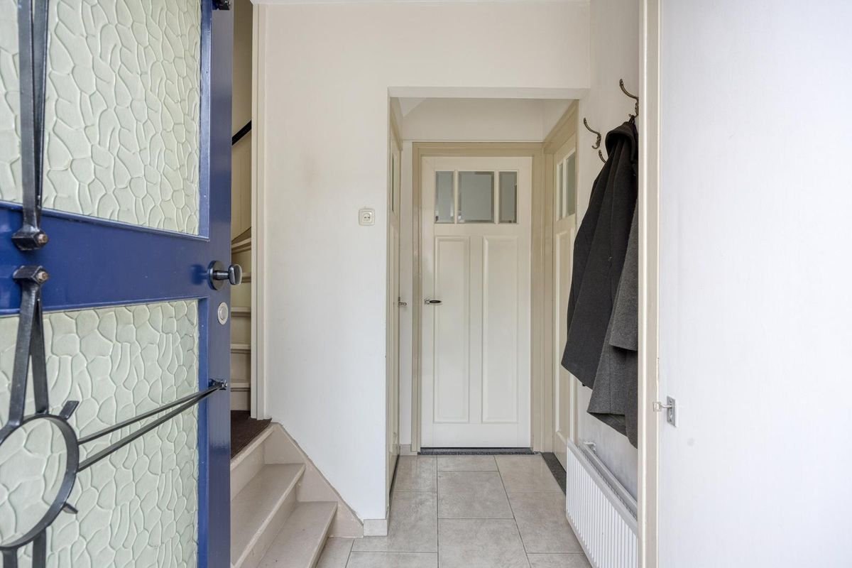 De entree is afgewerkt met een tegelvloer en stucwerk als wand- en plafondafwerking. De hal geeft toegang tot het toilet, de meterkast (7x 220V en 2 aardlekschakelaars) de woonkamer en halfopen keuken, de half verdiepte trapkast en de vaste trap naar de eerste verdieping.