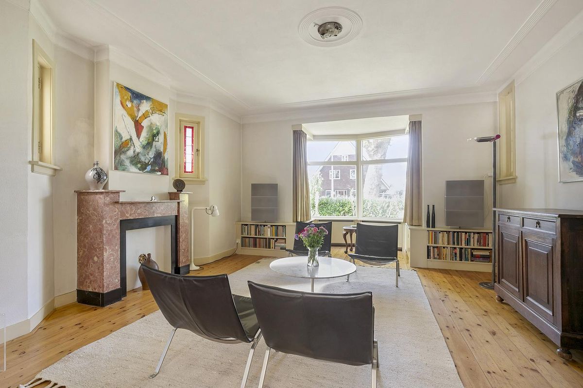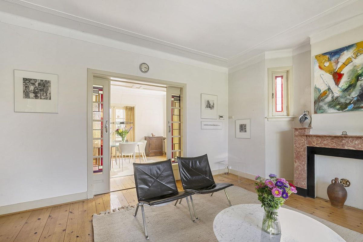De woonkamer ademt sfeer en karakter dankzij de charmante erker, de marmeren schouw en de houten vloer. Via de stijlvolle en-suite deuren is de lichte eetkamer bereikbaar – een heerlijke ruimte met plaats voor een grote eettafel. De eetkamer is voorzien van een inbouwkastenwand, een tweede marmeren schouw en openslaande deuren die toegang bieden tot het overdekte terras in de achtertuin. Hier lopen binnen en buiten op een natuurlijke manier in elkaar over.