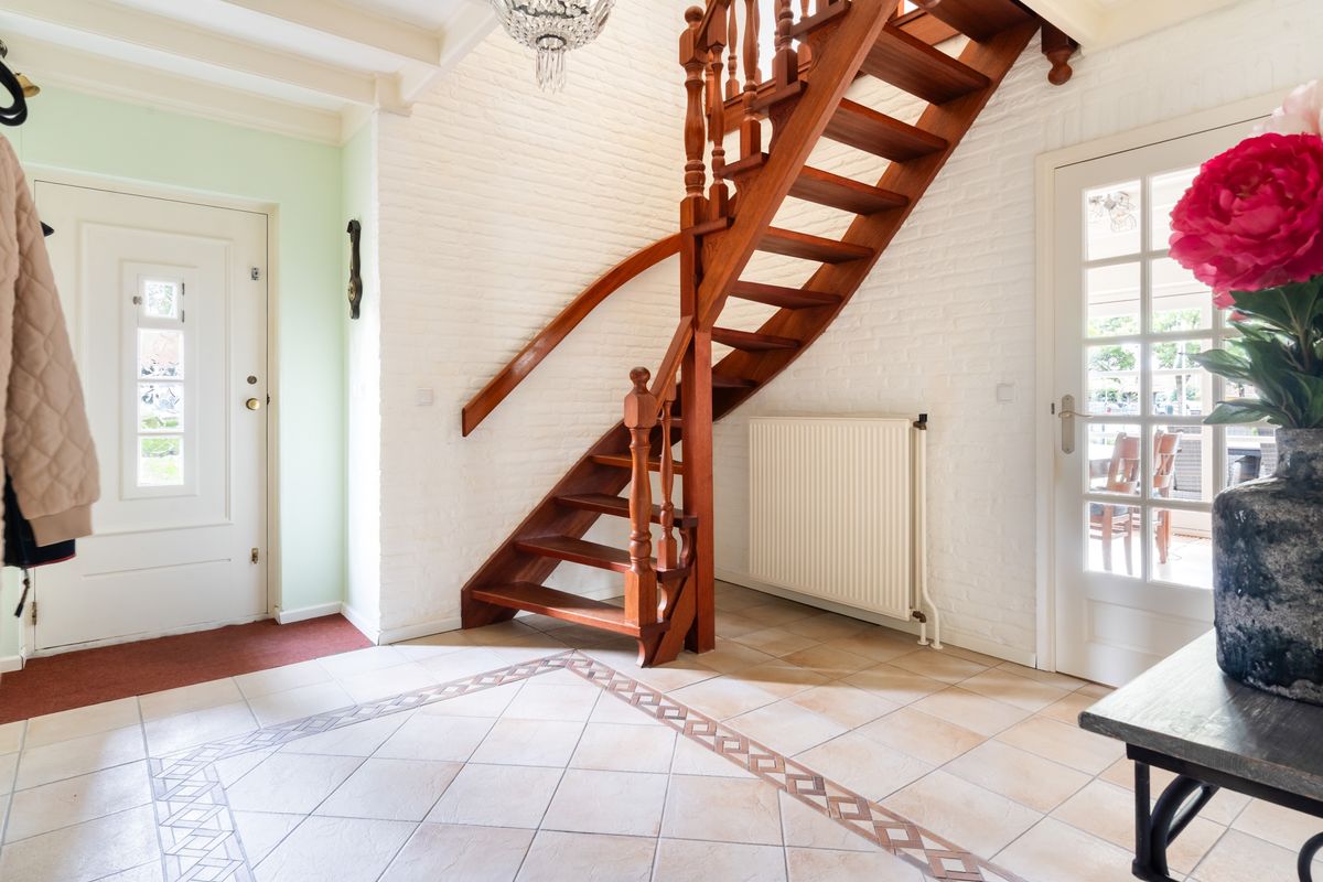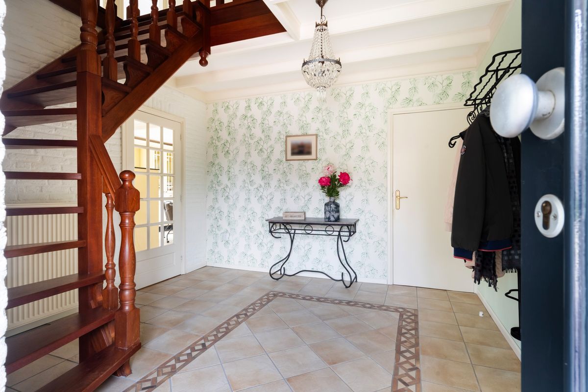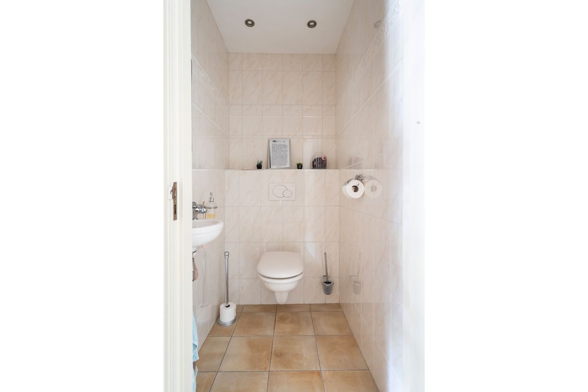 Ruime hal met open trap naar de verdieping, meterkast, volledig betegelde toiletruimte met hangend closet en fonteintje, toegang tot de woonkamer.