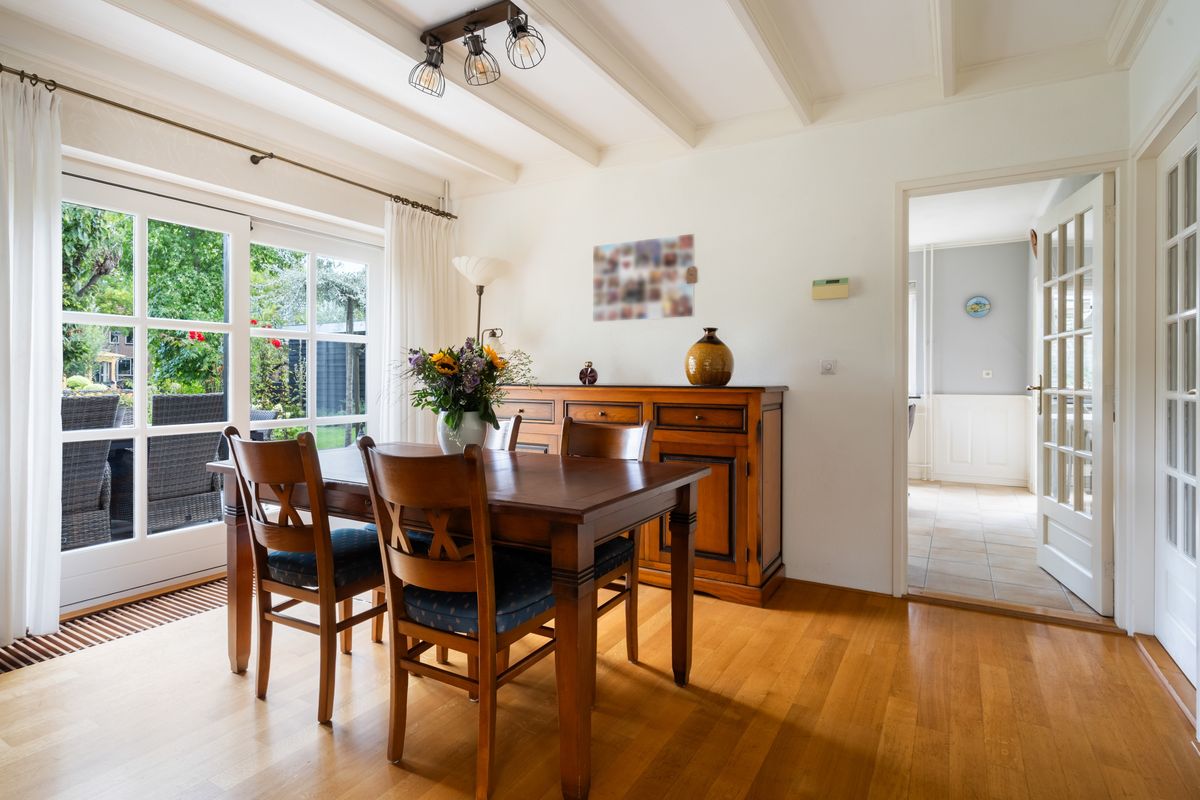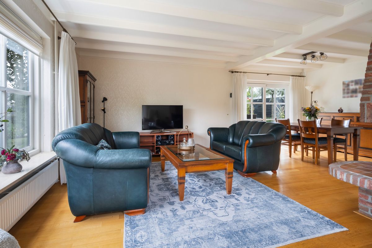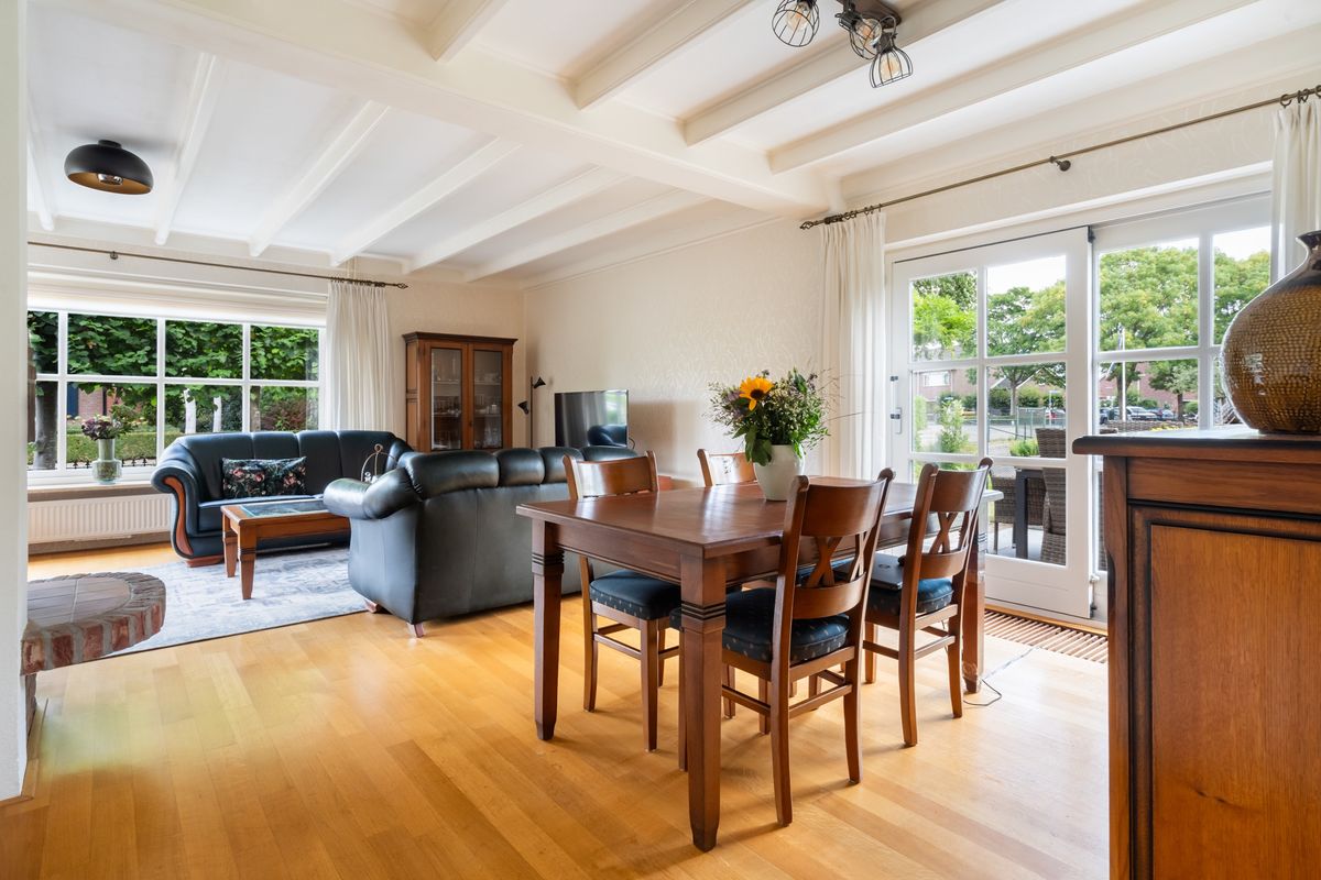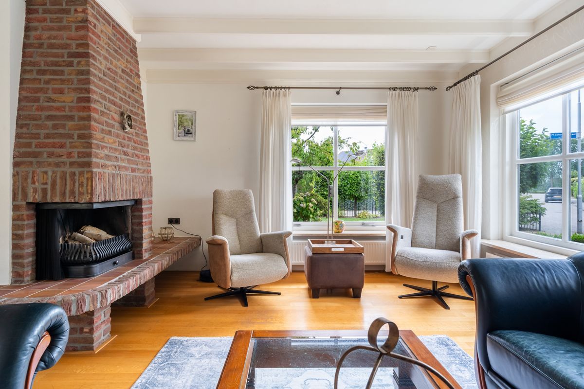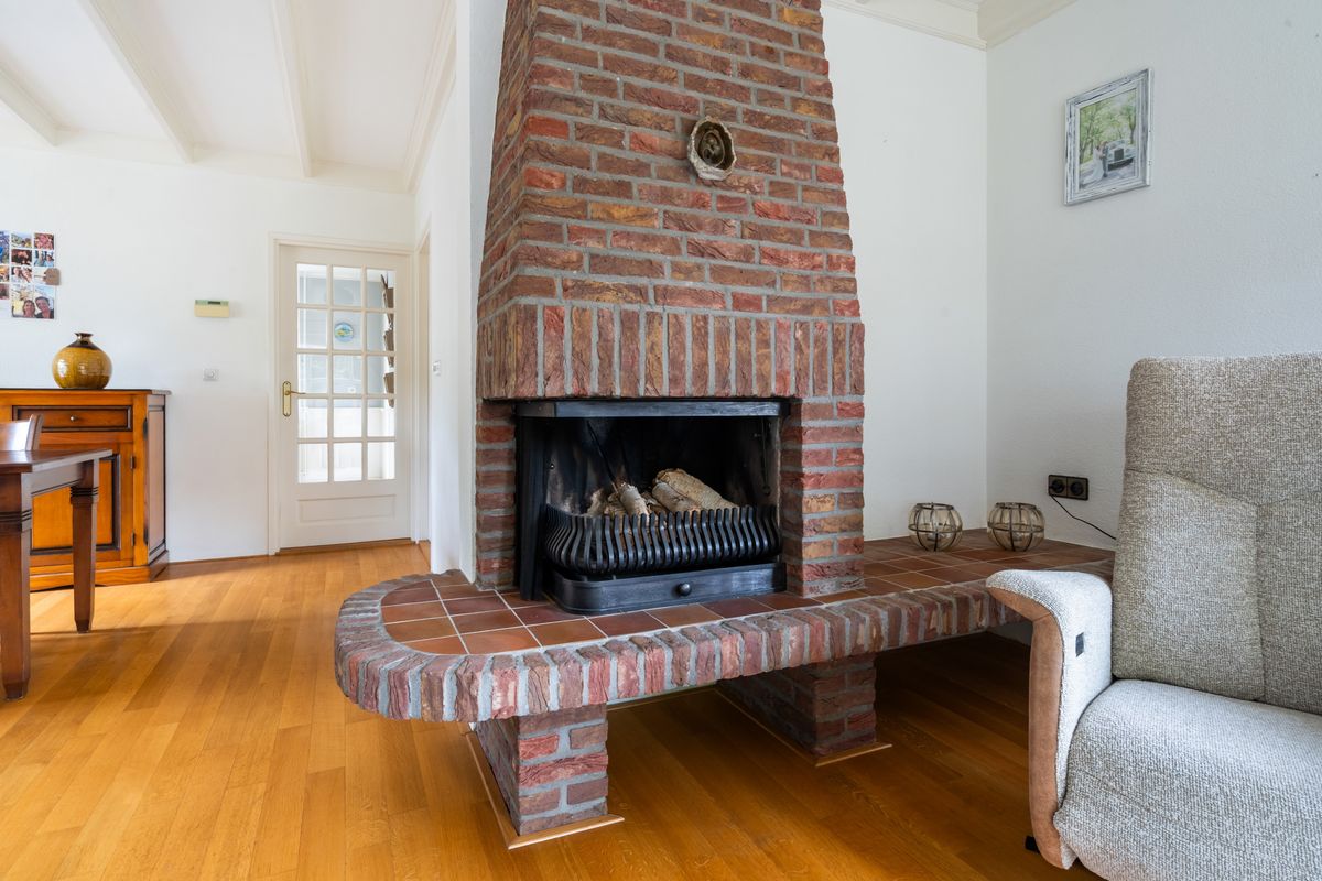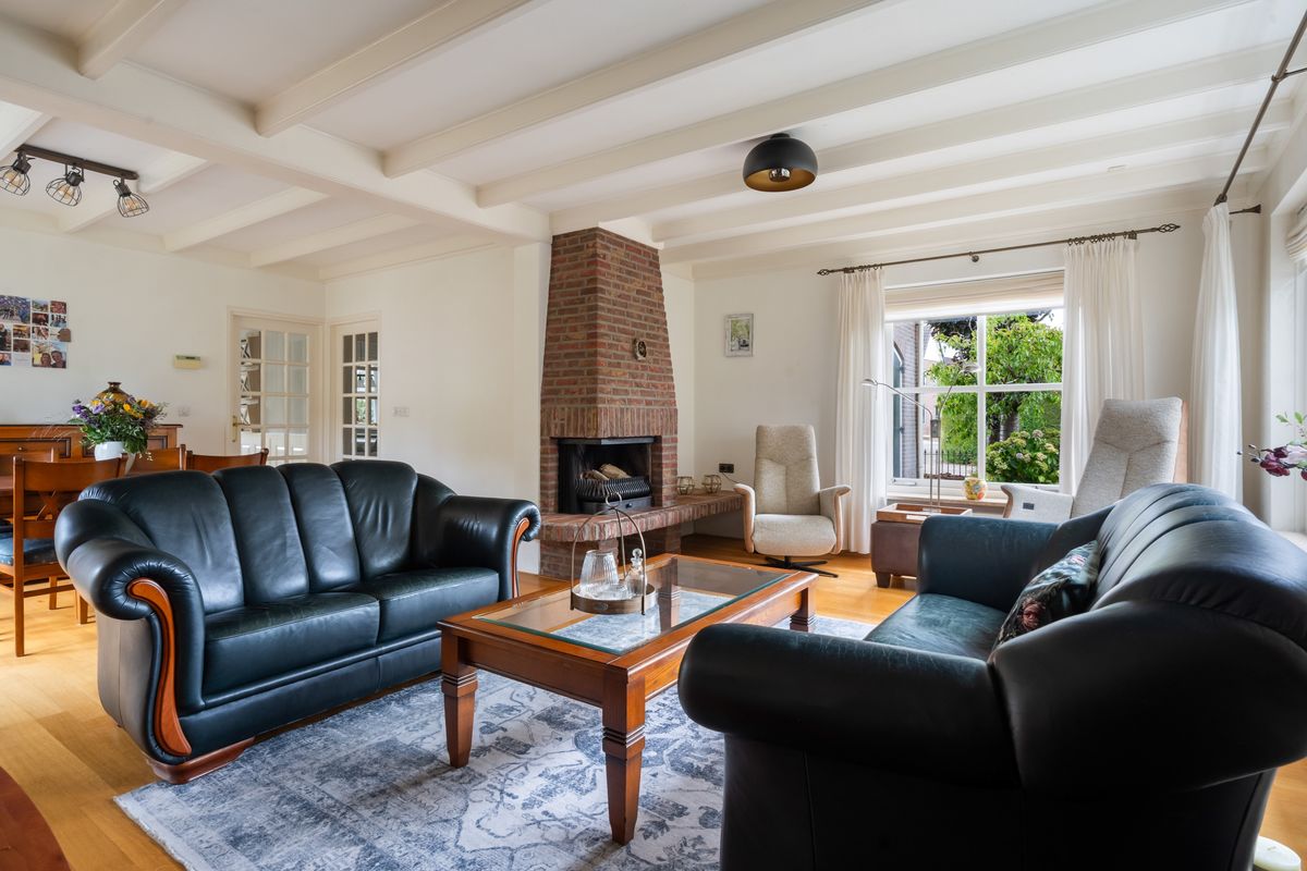 De ruime woonkamer met rondom daglicht zorgt voor een natuurlijke en subtiele scheiding van de leefruimtes. Het gedeelte voor in de woning leent zich perfect voor een riante zithoek, waardoor je aan de achterzijde een fijne eethoek creëert, nabij de keuken. De grote schuifpui verbindt de woonkamer met de zijtuintuin. De openhaard bij de zithoek zorgt voor extra sfeer en warmte tijdens de koude wintermaanden. De woonkamer is voorzien van een massief houten vloerafwerking.