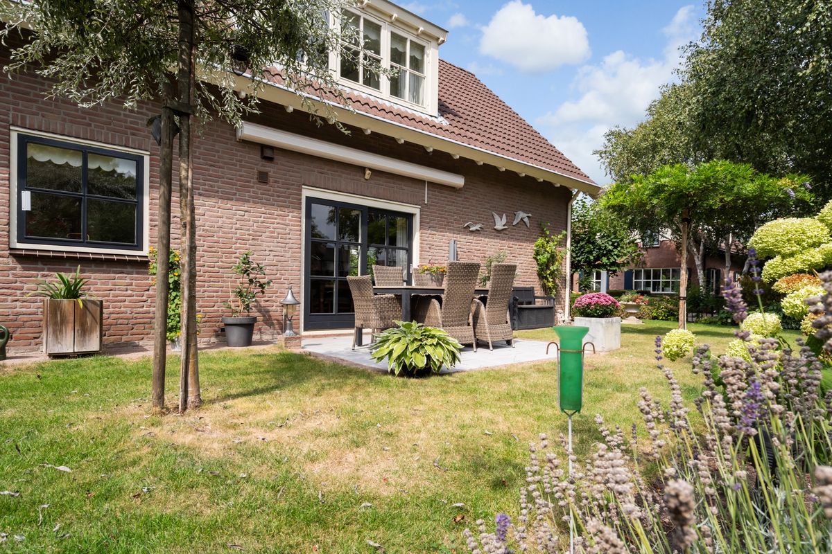 Rondom de woning ligt een keurig onderhouden en gevarieerd aangelegde tuin met sierbestrating, gazons, enkele bomen en volwassen struiken. De ruime voortuin heeft een oprit voor de auto.