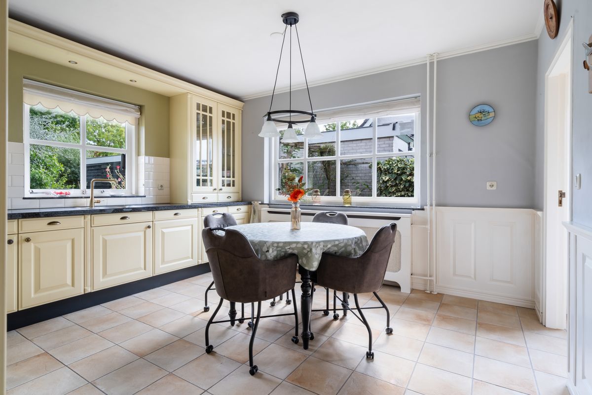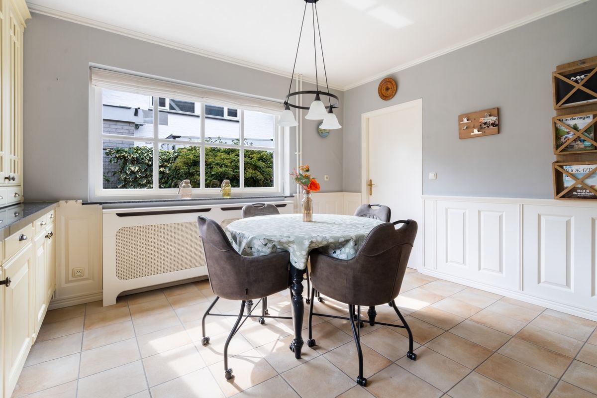 Vanuit de woonkamer toegang tot de woonkeuken met een in hoek opgestelde keuken met natuurstenen aanrechtblad voorzien van inductie kookplaat, afzuigschouw, oven, koelkast, magnetron en vaatwasser. De raampartij geeft u prettig licht in de keuken en een fraai uitzicht op de zijtuin en de achtertuin. De keuken en de hal zijn voorzien van een plavuizen vloerafwerking met comfortabele vloerverwarming.