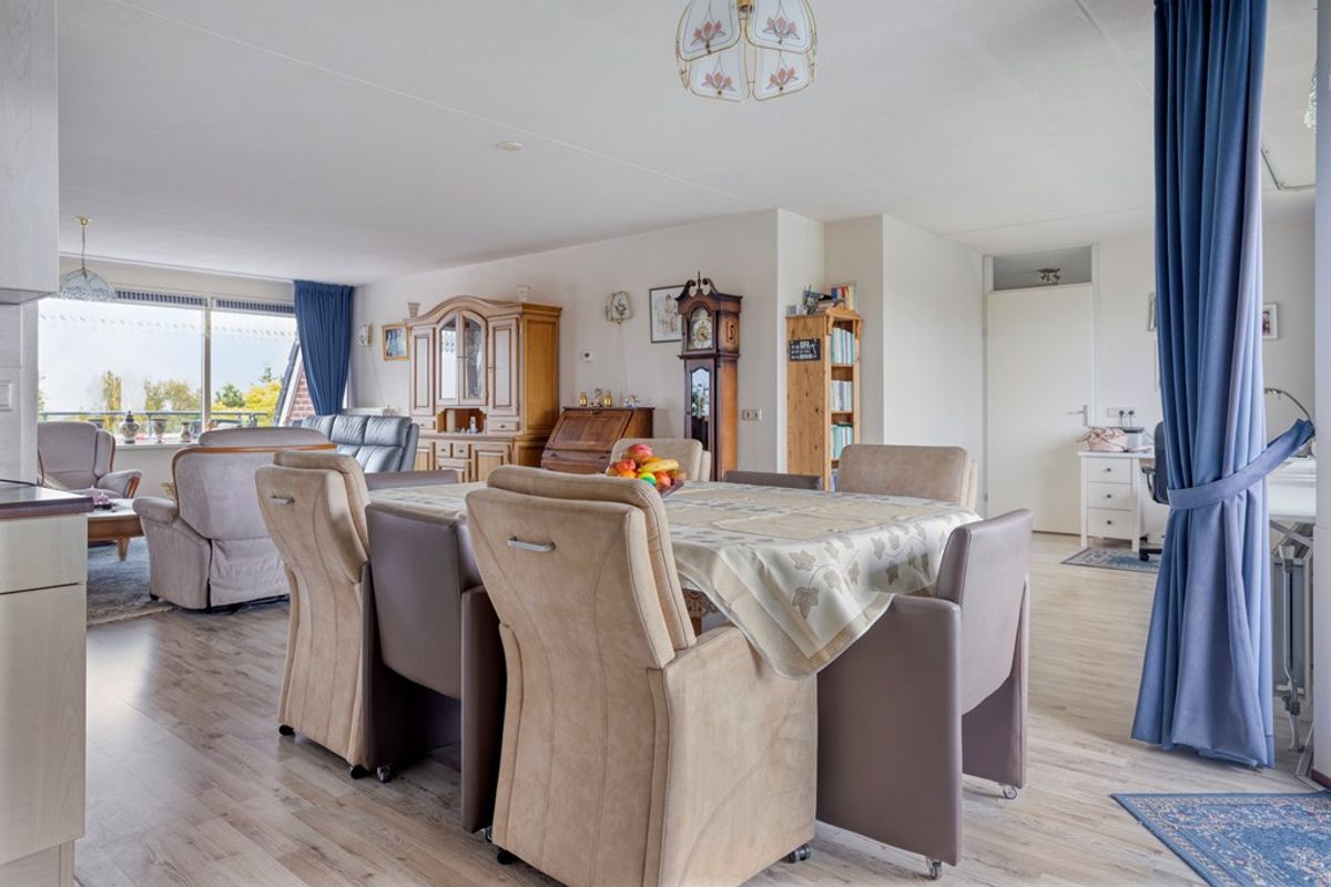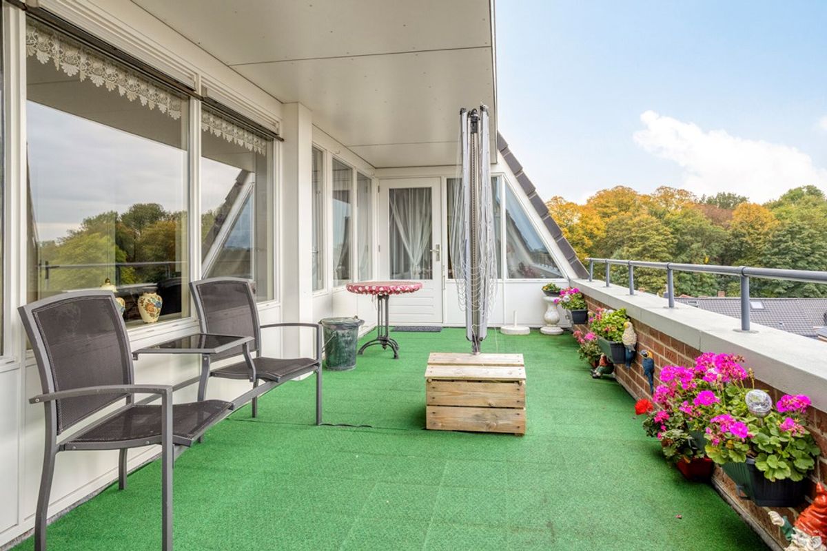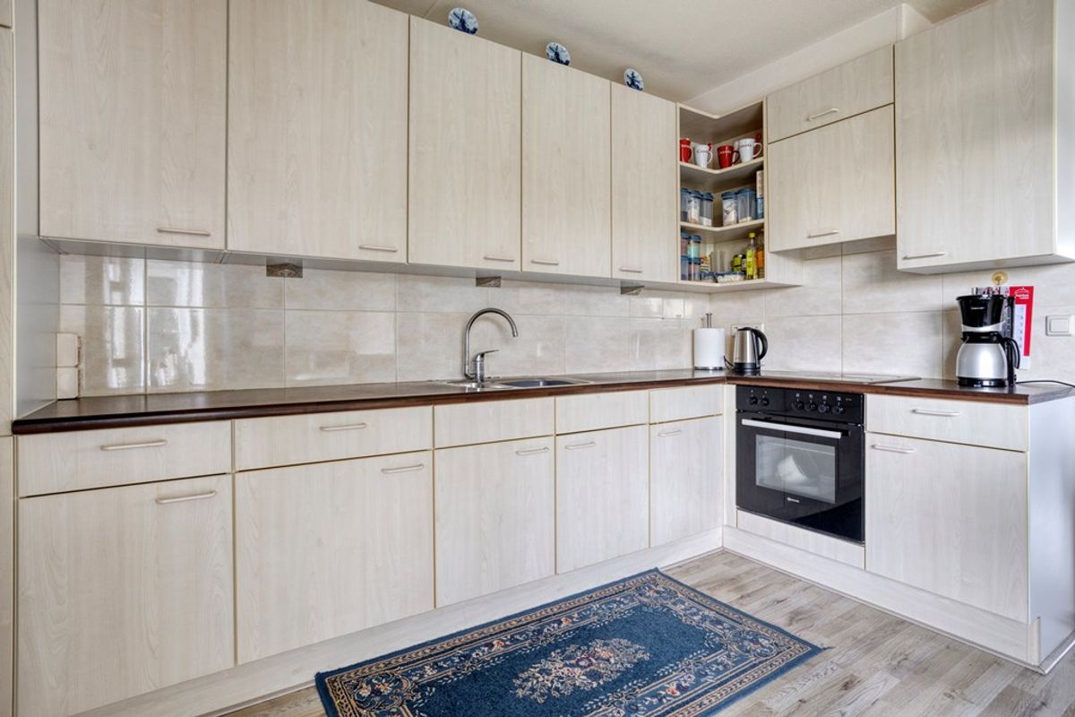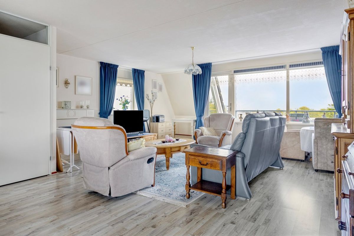 De keuken is voorzien van veel opbergruimte, waaronder een royale berging die perfect is voor extra voorraad of keukenapparatuur. Het penthouse beschikt over twee slaapkamers, waarvan de voorste kamer op het westen een eigen balkon heeft, een heerlijk plekje om te ontspannen en van de ondergaande zon te genieten. De badkamer en het aparte toilet zijn netjes afgewerkt en goed onderhouden.