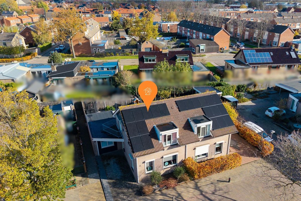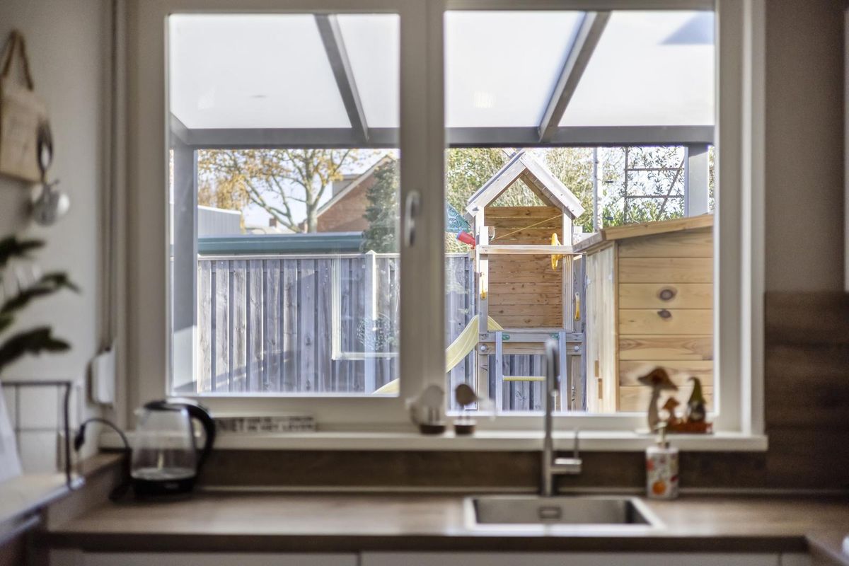 Aansluitend is er een praktische bijkeuken met de aansluiting voor de wasmachine, de CV-ketel (2017). Daarnaast beschikt de begane grond (voorheen garage) over een extra kamer die ideaal is als kantoor, hobbyruimte of speelkamer. Tot slot is er nog een inpandige berging met vaste kast, de omvormer van de zonnepanelen en een deur naar de tuin.