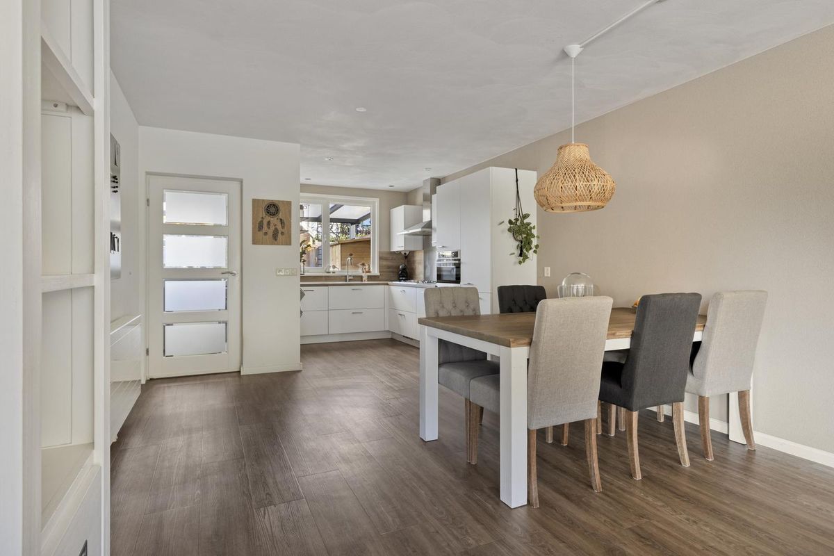 Welkom! Je stapt de woning binnen in een nette hal met de meterkast, een modern (hang)toilet met fonteintje en de trap naar de eerste verdieping. Vanuit hier loop je door naar de woonkamer aan de voorzijde van de woning. Deze is verrassend ruim opgezet en voorzien van een fraaie pvc-vloer. Dankzij de rolluiken houd je het hier op warme dagen heerlijk koel. Grenzend aan de woonkamer vind je de keuken in hoekopstelling. Deze is in 2017 vernieuwd en uitgerust met alle gemakken van nu: een koelkast, 5-pits gasfornuis met afzuigkap, combi-oven en vaatwasser. Het grote raam boven het werkblad zorgt voor een prettige lichtinval en is eveneens voorzien van een rolluik.