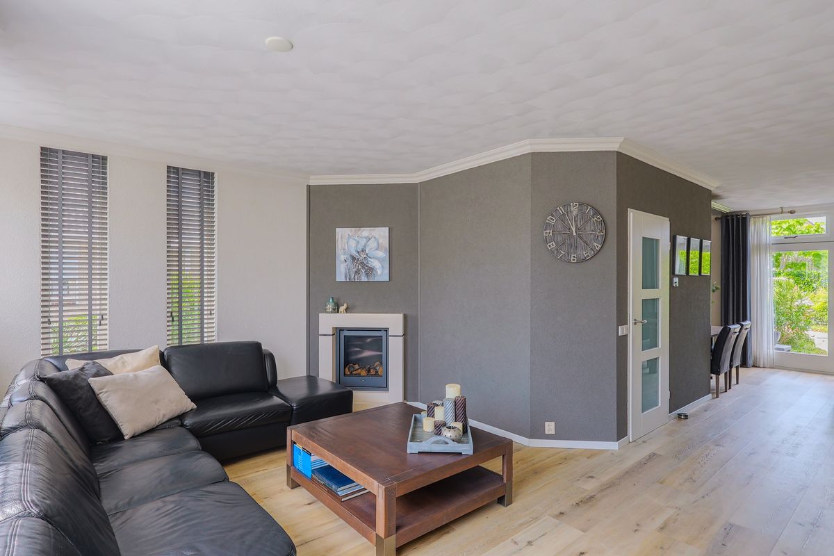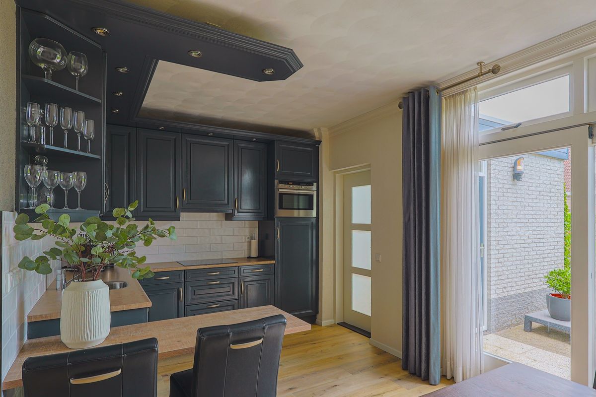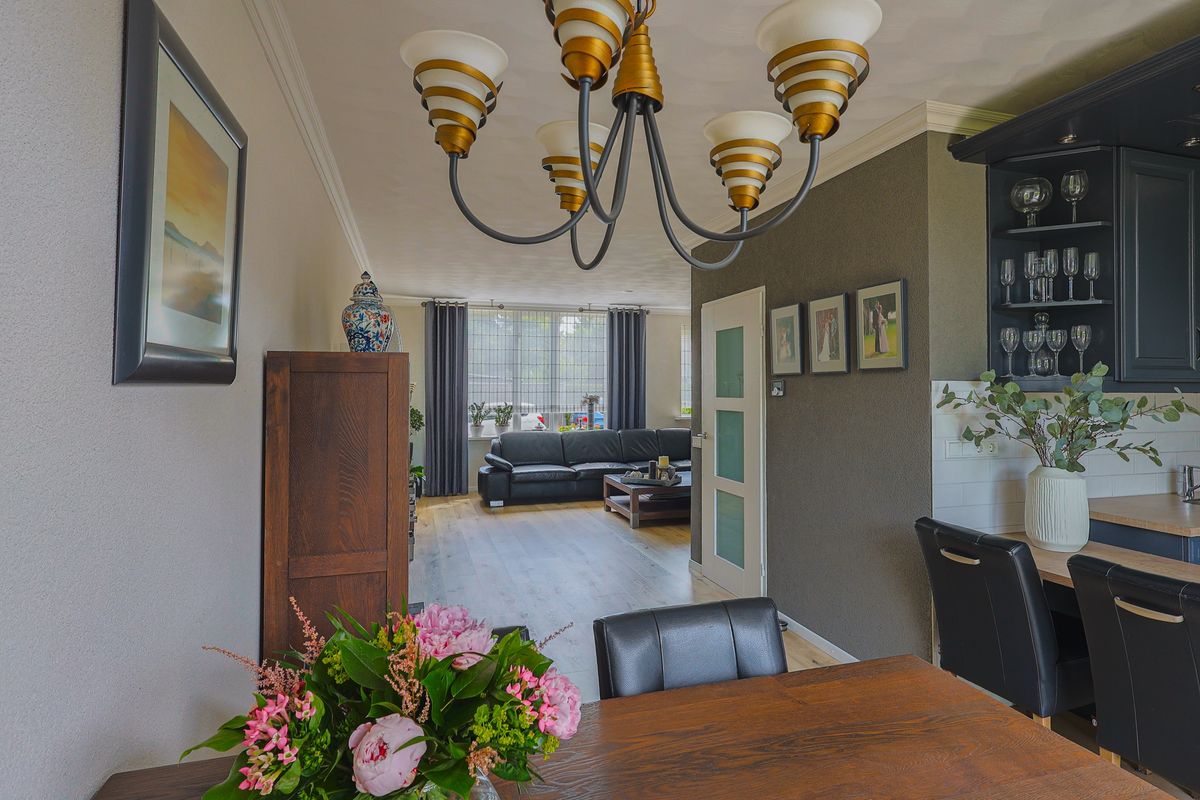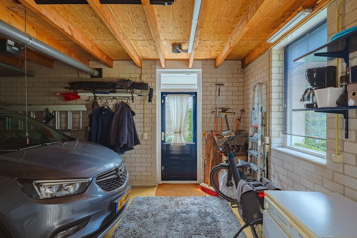 Via de overdekte entree toegang in de ruime hal met de nette en betegelde toiletruimte met toilet en een fonteintje, de garderoberuimte, de meterkast en de trapopgang. De royale L-vormige living is afgewerkt met een fraaie PVC-vloer met vloerverwarming en een schuurwerk stucplafond. Aan de voorzijde is het gezellige zitgedeelte rondom de gashaard gesitueerd. Dankzij de grote raampartijen geniet dit gedeelte van volop daglicht. Aan de achterzijde bevindt zich het eetgedeelte, grenzend aan de keuken en de schuifpui. Deze keuken is in 2020 deels gemoderniseerd en rijkelijk uitgerust met onder andere een inductiekookplaat, een combi-oven, een koelkast en een vaatwasser. De bijkeuken geeft toegang tot de inpandige garage en de achtertuin. Deze ruimte met lichtkoepel is voorzien van de CV-installatie, de warmtepomp, de zonnepanelenomvormer en de witgoedaansluitingen. De inpandige garage is van binnenuit vanuit de bijkeuken toegankelijk en meet ca. 6,87 x 3,86 meter. Richting de carport bevindt zich een elektrische garagedeur en aan de zijde van de woning is er hiernaast nog een aparte loopdeur richting de zijtuin. De garage is voorzien van zowel een spoelbak als elektra.