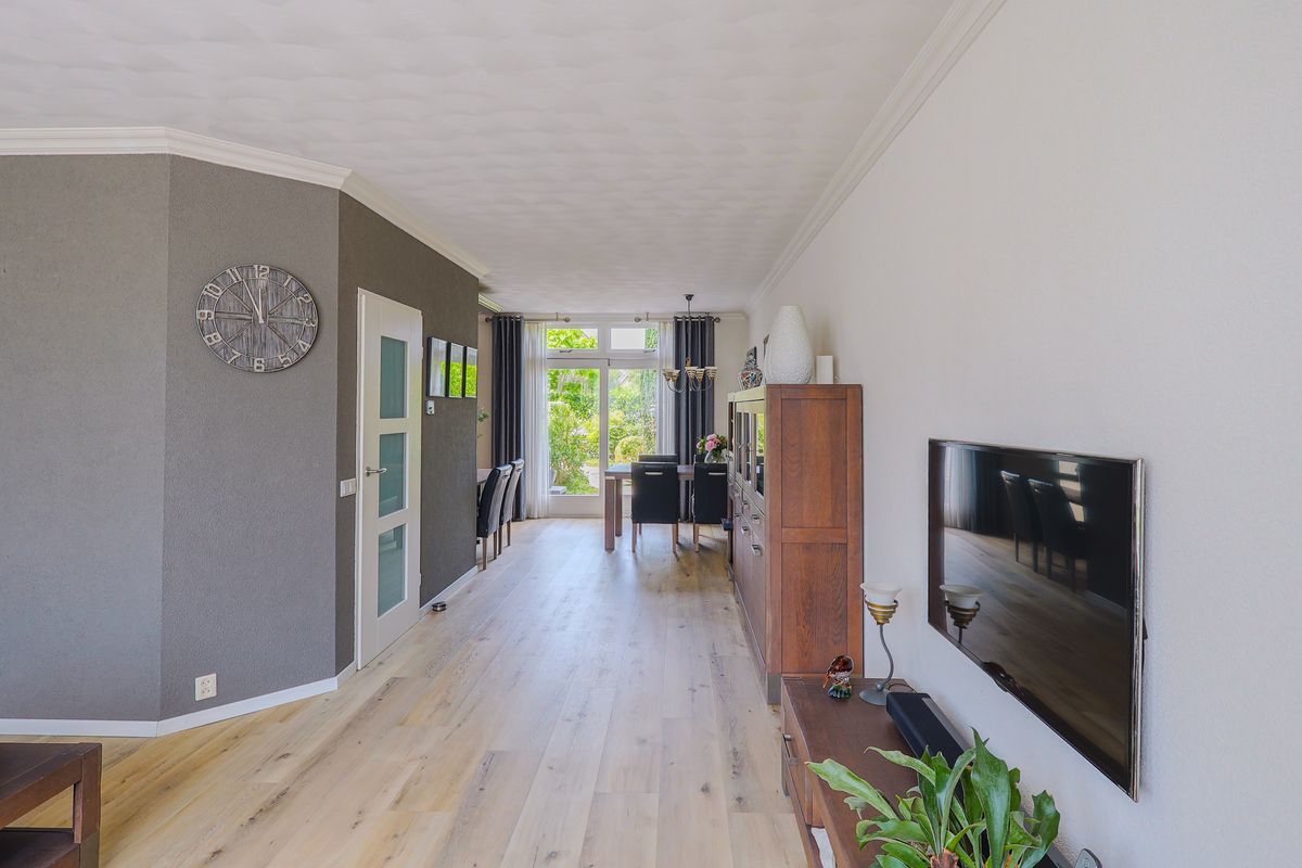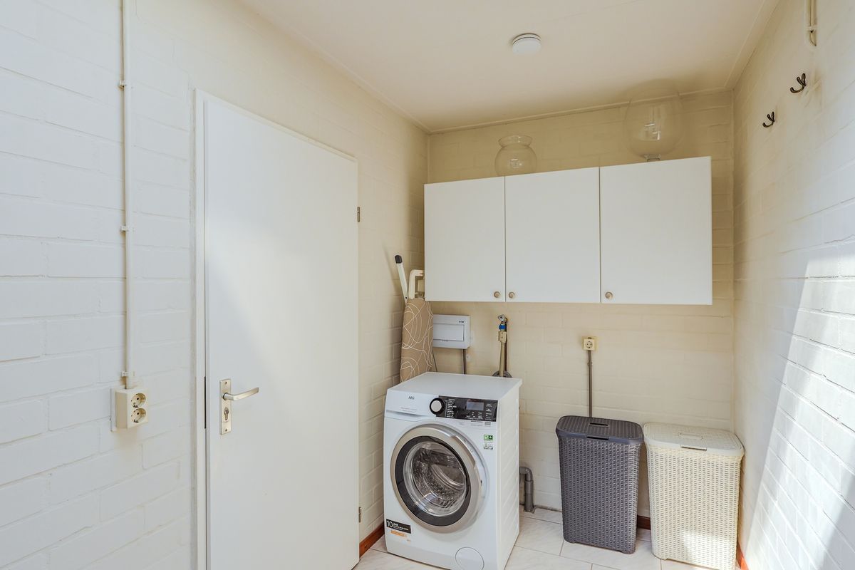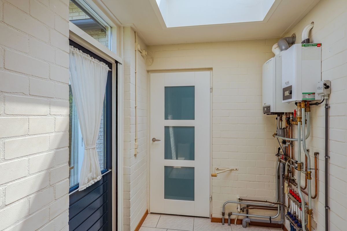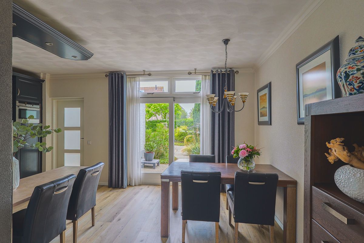 Via de overdekte entree toegang in de ruime hal met de nette en betegelde toiletruimte met toilet en een fonteintje, de garderoberuimte, de meterkast en de trapopgang. De royale L-vormige living is afgewerkt met een fraaie PVC-vloer met vloerverwarming en een schuurwerk stucplafond. Aan de voorzijde is het gezellige zitgedeelte rondom de gashaard gesitueerd. Dankzij de grote raampartijen geniet dit gedeelte van volop daglicht. Aan de achterzijde bevindt zich het eetgedeelte, grenzend aan de keuken en de schuifpui. Deze keuken is in 2020 deels gemoderniseerd en rijkelijk uitgerust met onder andere een inductiekookplaat, een combi-oven, een koelkast en een vaatwasser. De bijkeuken geeft toegang tot de inpandige garage en de achtertuin. Deze ruimte met lichtkoepel is voorzien van de CV-installatie, de warmtepomp, de zonnepanelenomvormer en de witgoedaansluitingen. De inpandige garage is van binnenuit vanuit de bijkeuken toegankelijk en meet ca. 6,87 x 3,86 meter. Richting de carport bevindt zich een elektrische garagedeur en aan de zijde van de woning is er hiernaast nog een aparte loopdeur richting de zijtuin. De garage is voorzien van zowel een spoelbak als elektra.