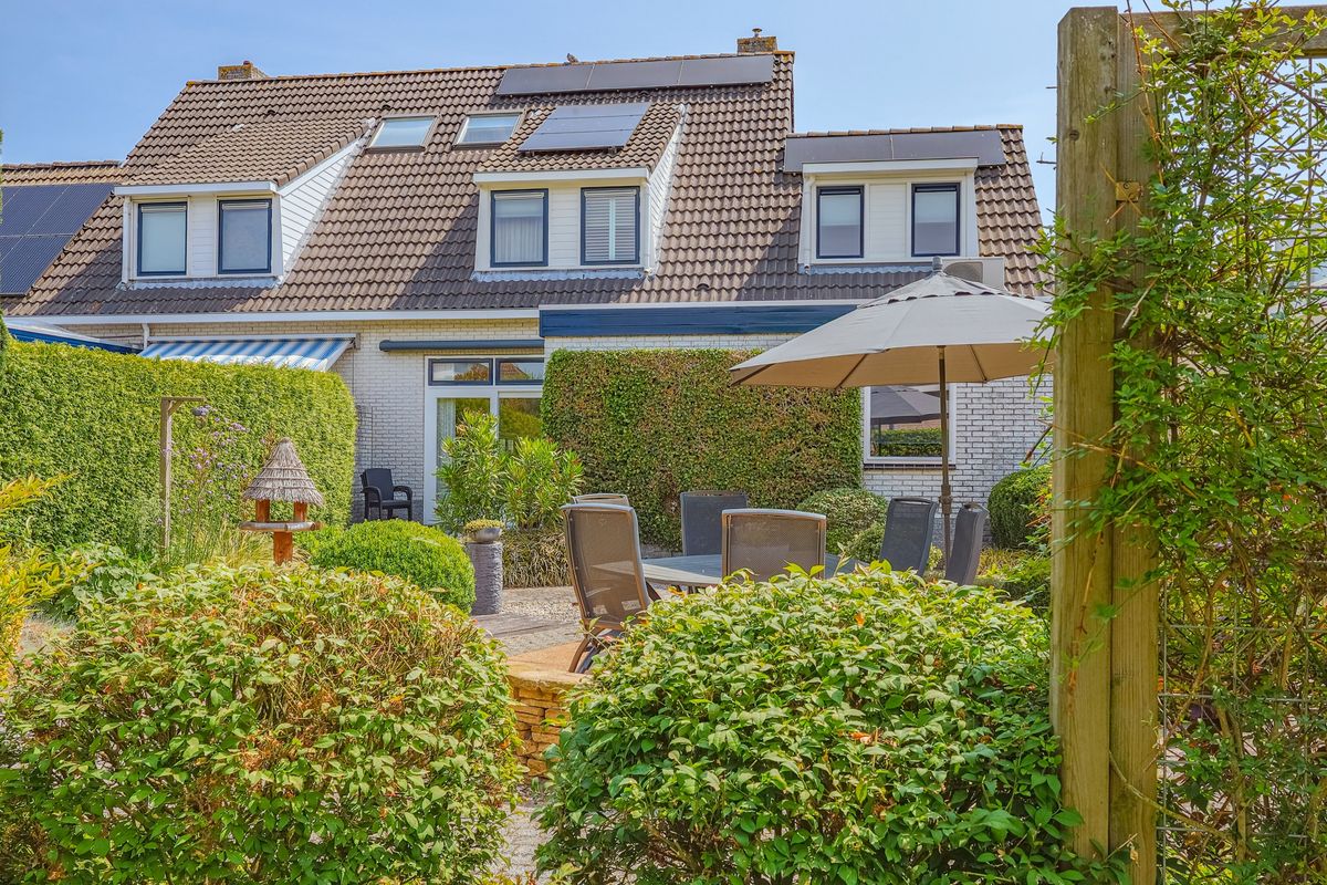 Naast de garage bevindt zich een achterom; via een poort bereik je hier de zijtuin met een betegeld pad naar de zonnige, op het westen gelegen achtertuin. Deze laatste is fraai aangelegd met een rijke variatie aan beplanting, meerdere opgemetselde borders en grindstroken. Het centrale middelpunt wordt gevormd door een ruim betegeld terras. Aan de gevel is hier een zonnescherm geplaatst waardoor je zowel in de zon als in de schaduw van de tuin kunt genieten.