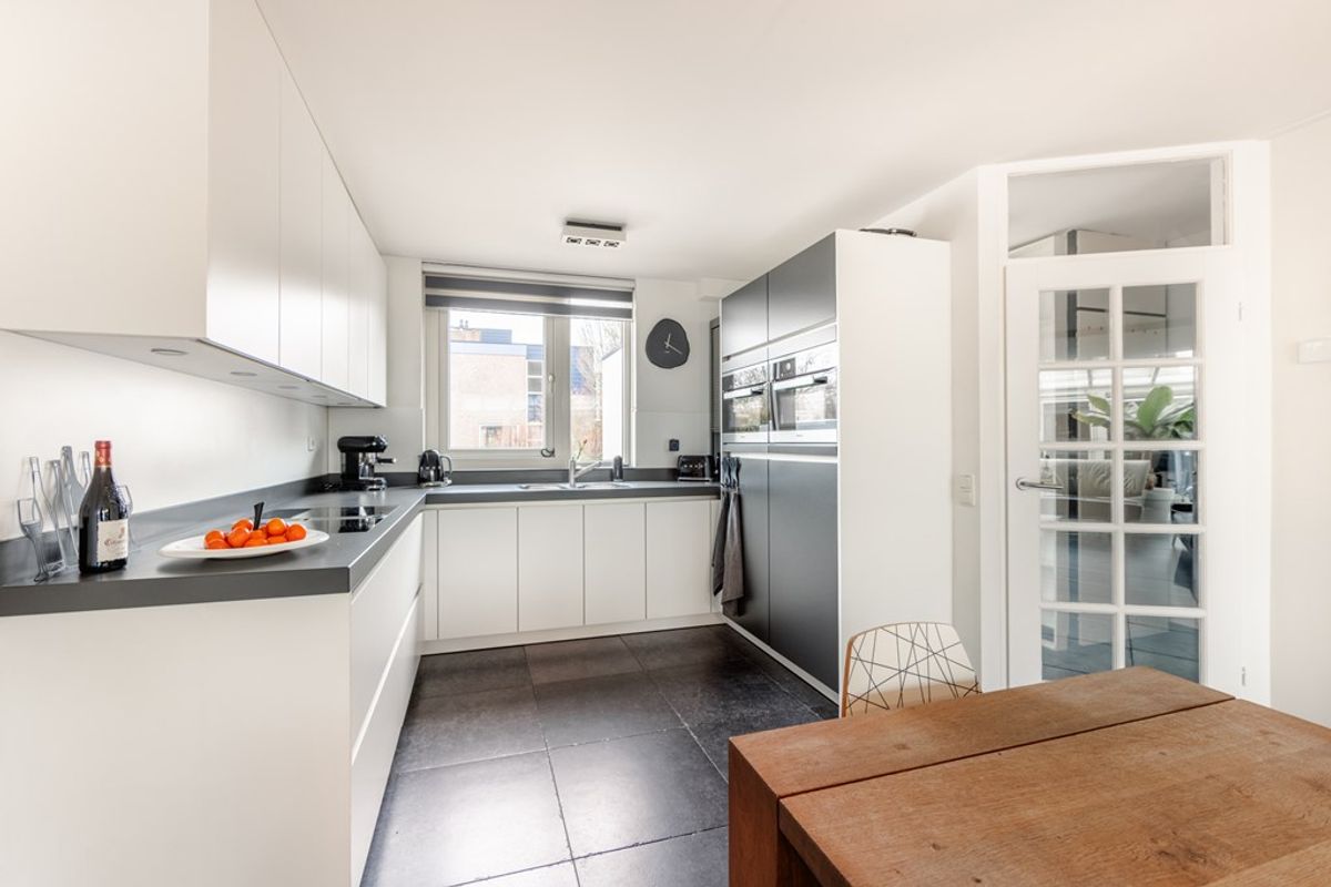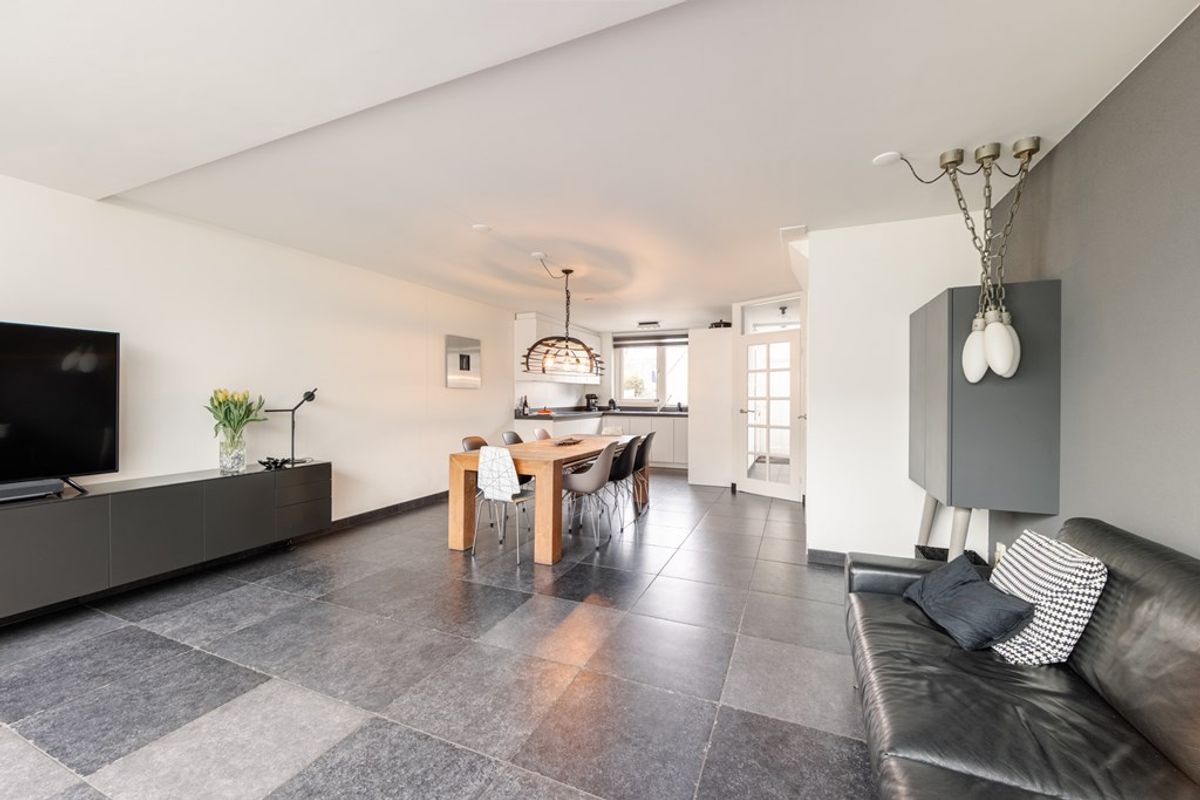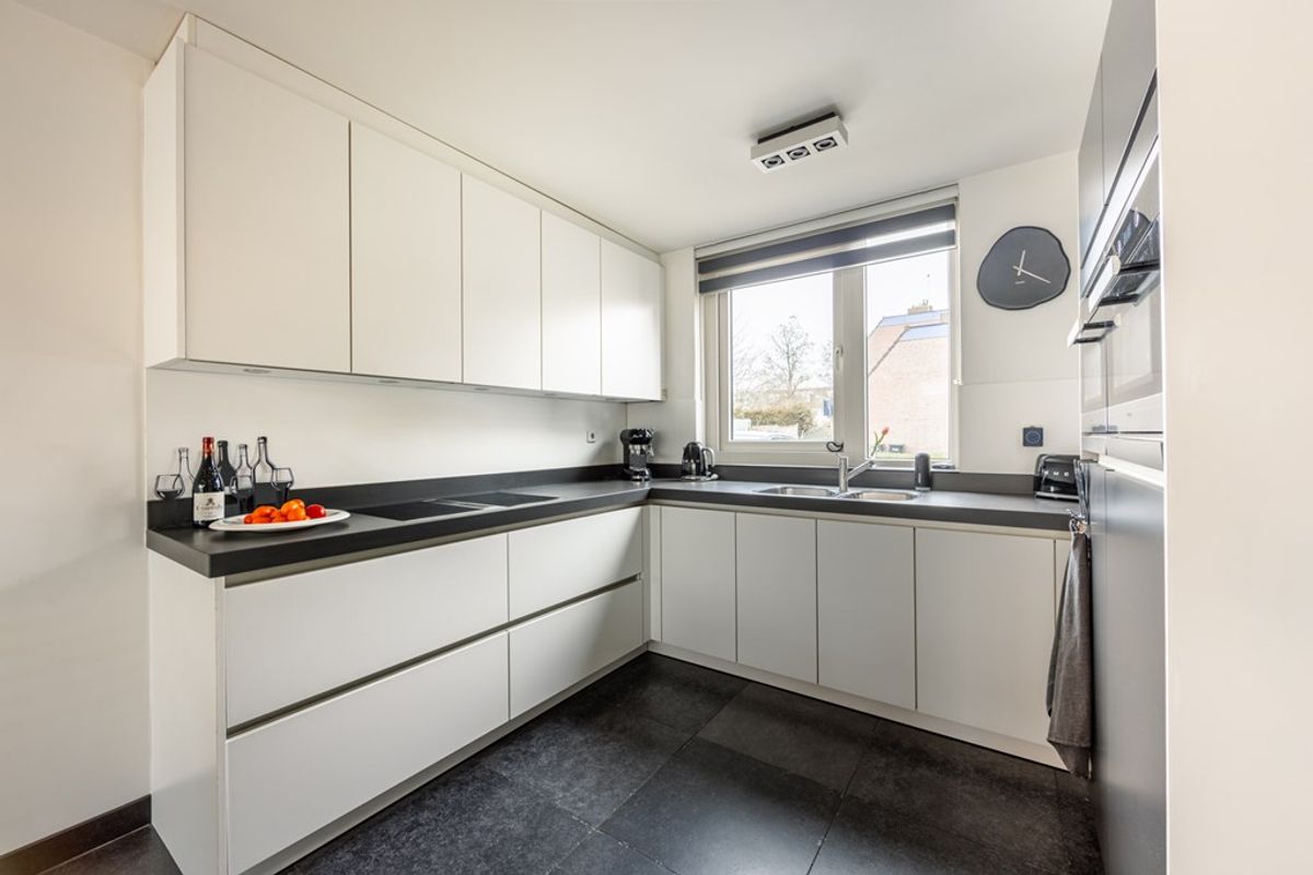 De moderne halfopen keuken heeft inbouwapparatuur. De natuurstenen vloer heeft vloerverwarming, is extra geïsoleerd en er zijn openslaande deuren naar de tuin.