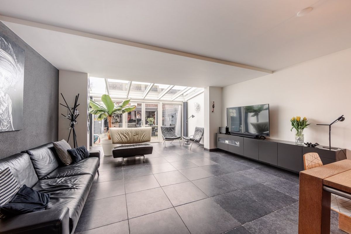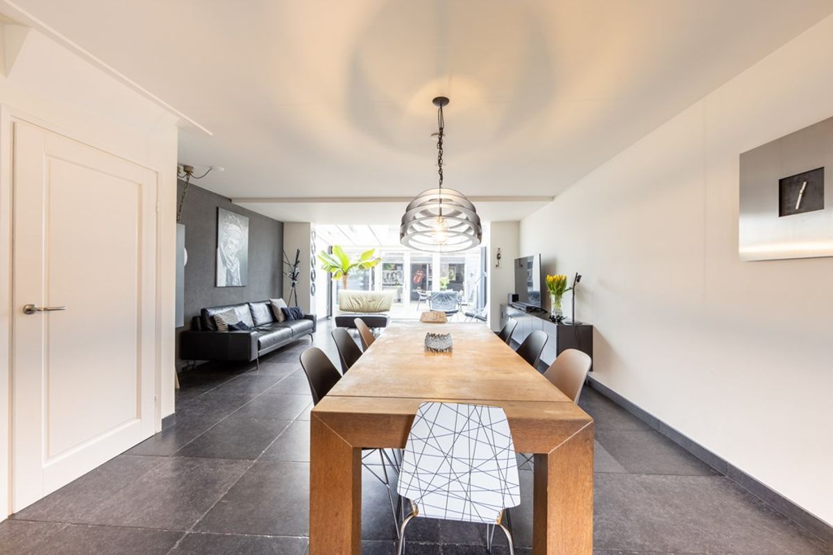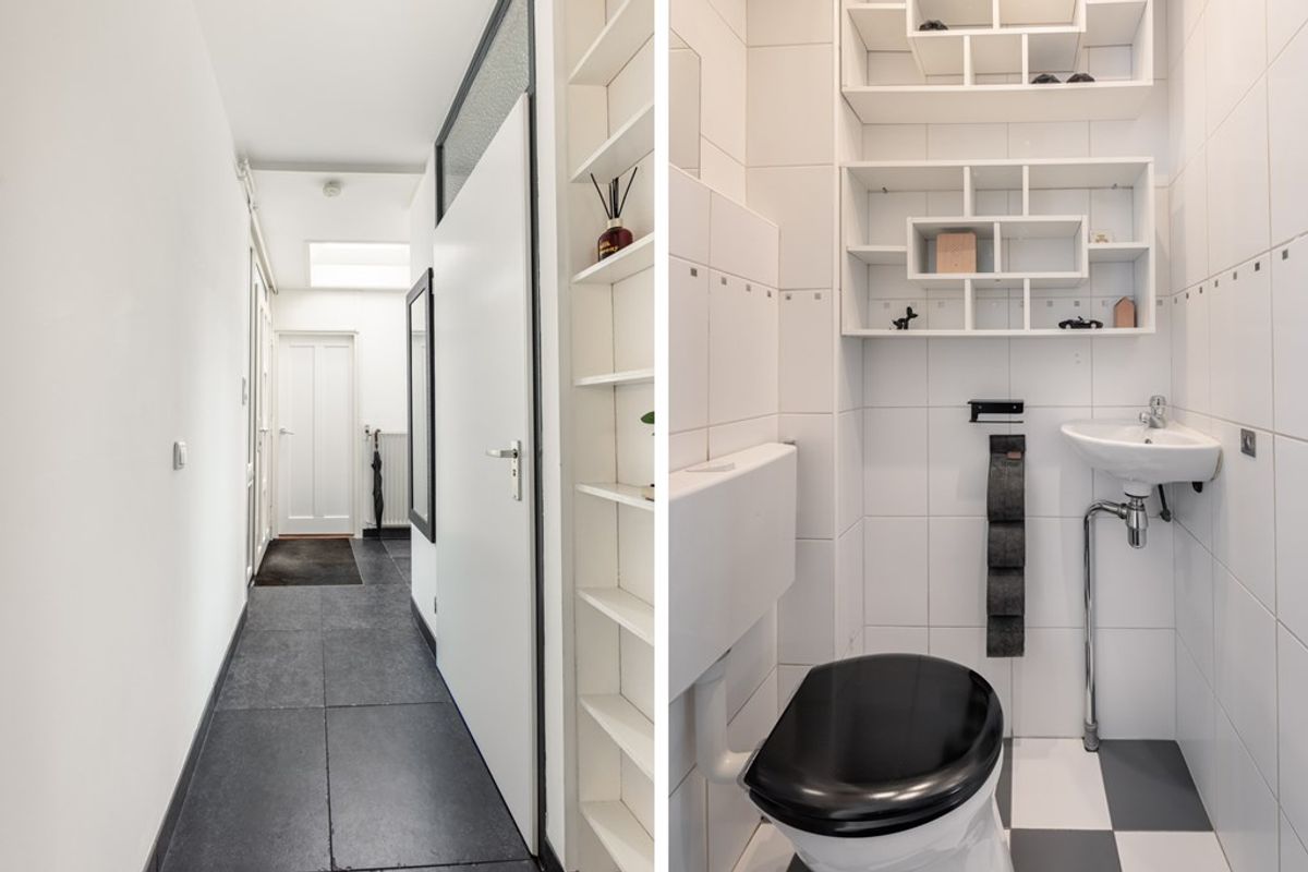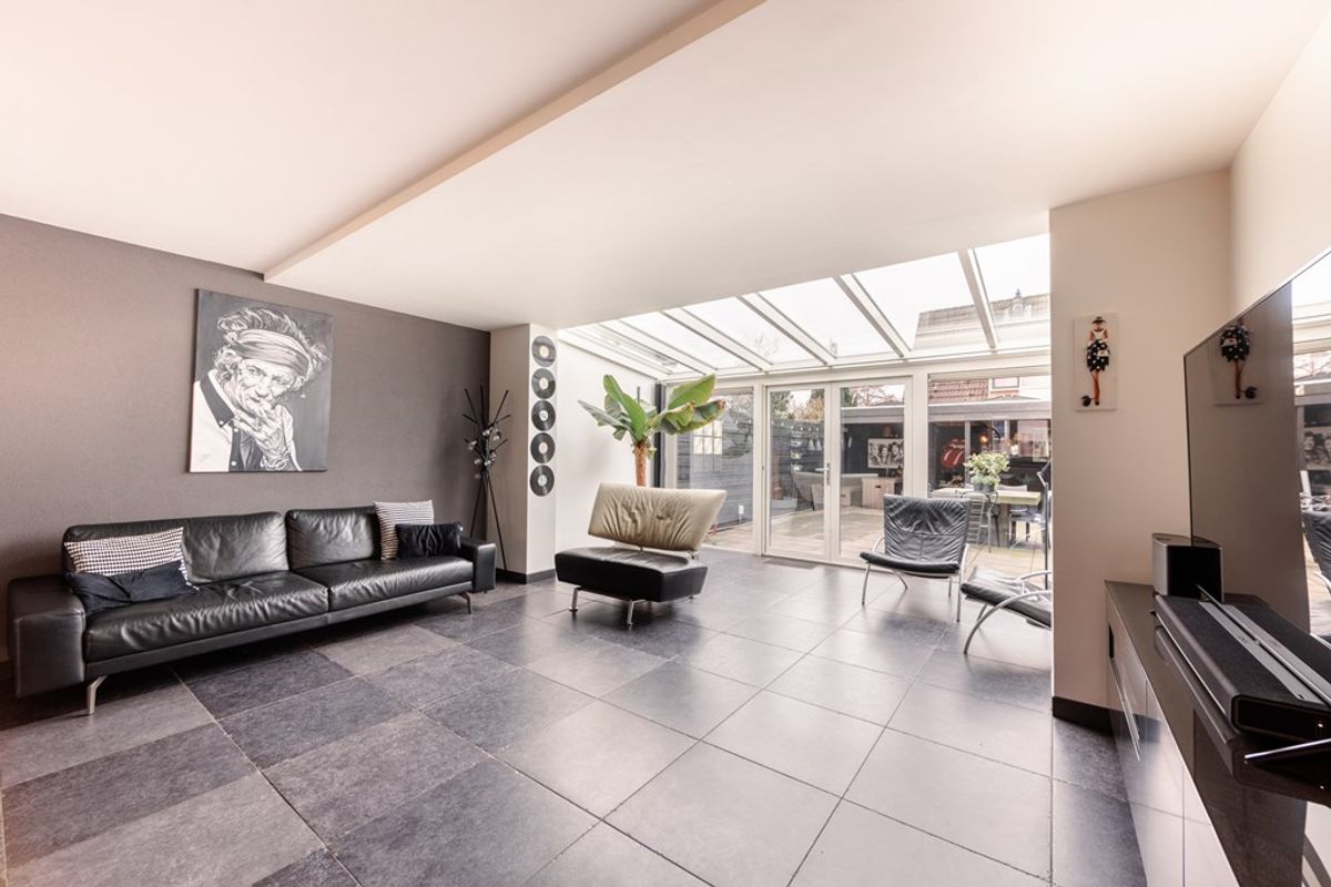 De hal met toilet biedt toegang tot een werkkamer en de woonkamer. Wat gelijk opvalt, is dat de interne berging bij de woonkamer is getrokken en de uitbouw met serre aan de achterzijde. Daardoor is er een enorme klap ruimte bijgekomen.