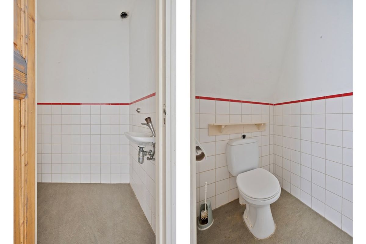 Overloop met toilet en kast, woonkamer, slaapkamer, badkamer en keuken.