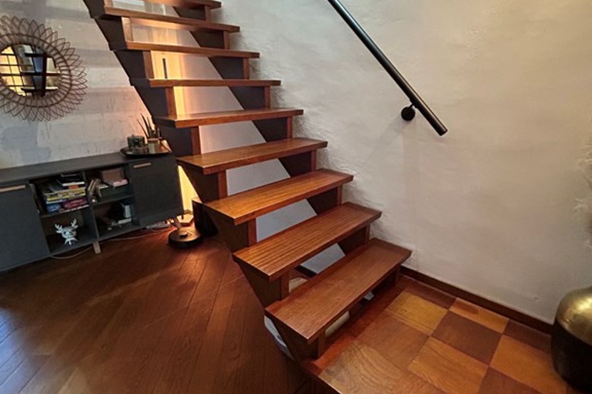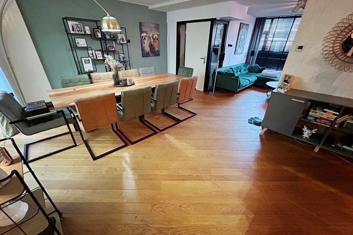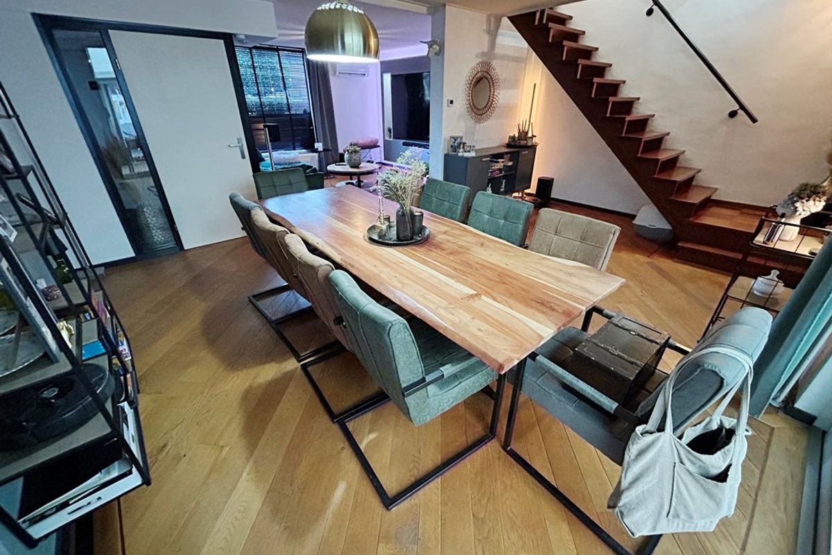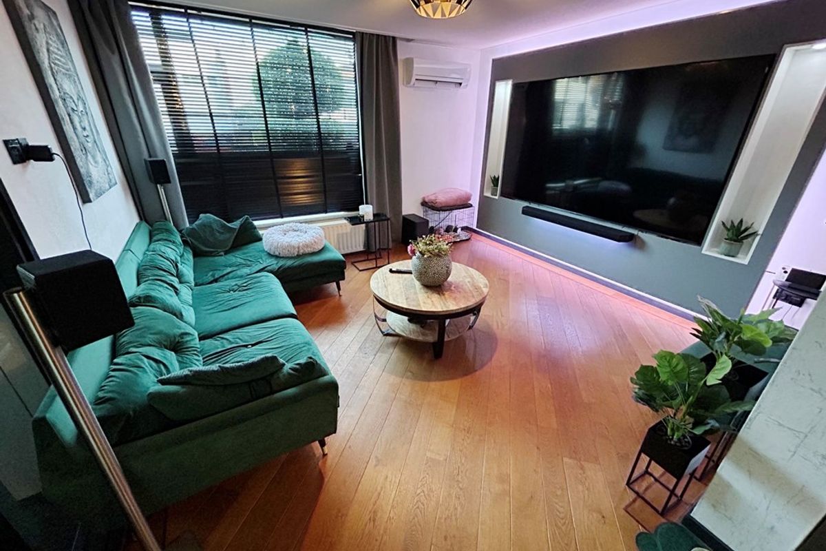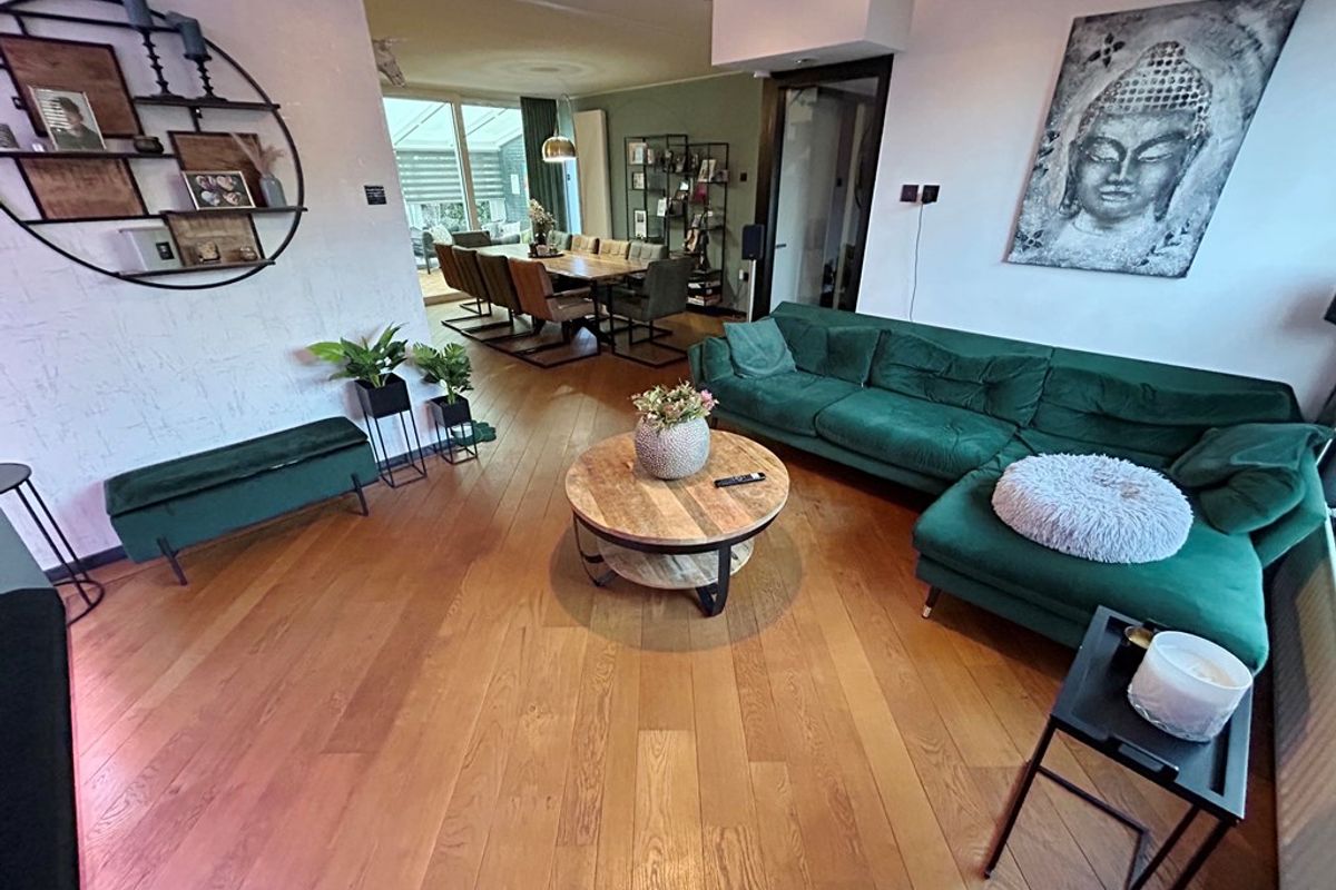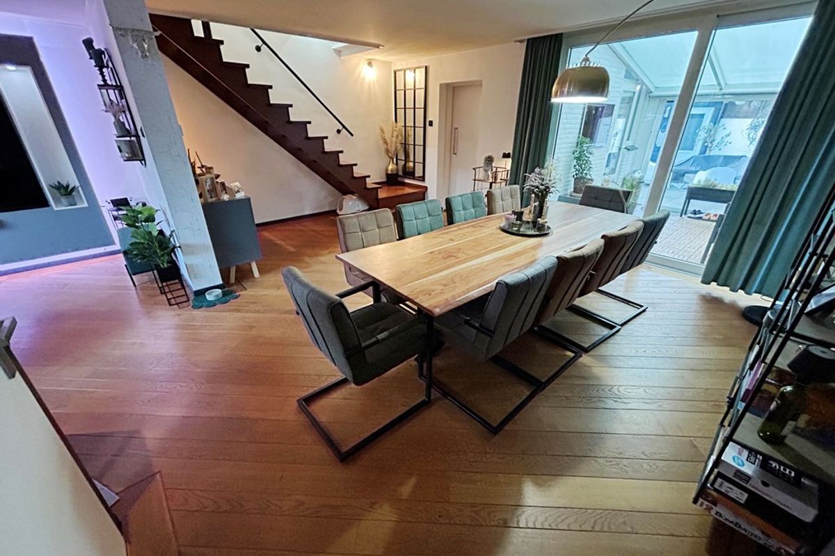 Woonkamer 7,90 x 5,90/4,00 met parketvloer, spanplafond, airco (W/K), schuifpui naar veranda, deur naar keuken en open trap naar verdieping.