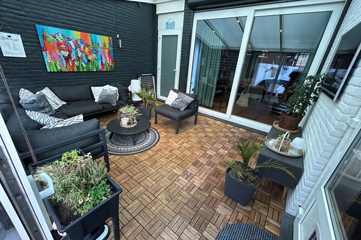 Veranda 4,25 x 3,80 met verlichting, elektrisch bedienbaar zonnescherm, elektrisch bedienbare rolluiken en schuifpui naar achtertuin.