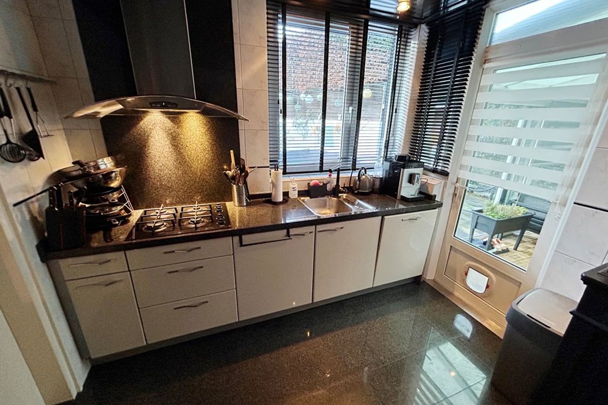 Keuken 3,60 x 2,80 met granieten vloer, spanplafond met inbouwspots, deur naar veranda en bijkeuken en hoogglans aanbouwkeuken met 4-pits gasfornuis met RVS-afzuigunit, vaatwasser, magnetron, koelkast, apothekerskast en spoelbak.