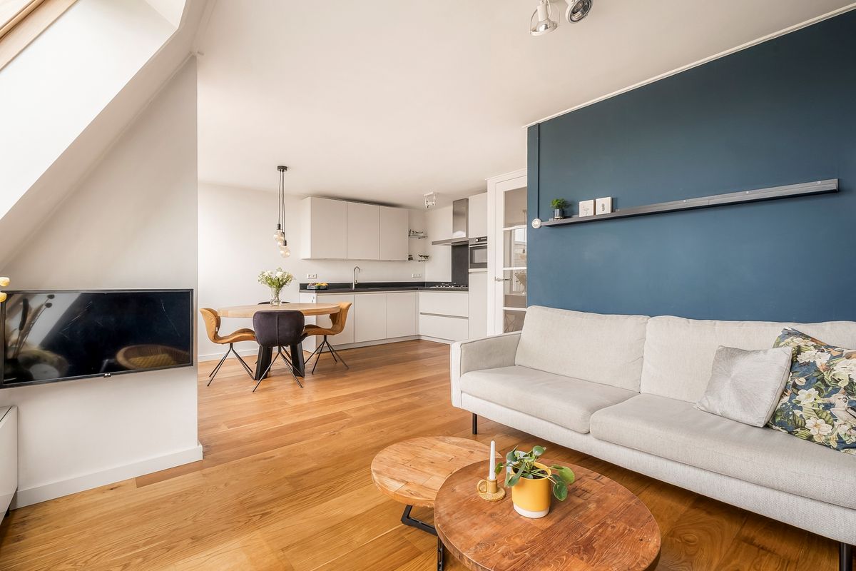 Het appartement ligt op de bovenste etage, wat zorgt voor veel licht, privacy en een vrij uitzicht. Bij binnenkomst valt direct de lichte woonkamer op, met grote raampartijen die zorgen voor een prettige, zonnige sfeer. Door het hele appartement ligt een fraaie houten vloer met vloerverwarming, wat zorgt voor een warme uitstraling (en warme voeten). Schuine wanden geven extra ruimte waardoor het appartement veel groter aanvoelt dan je zou verwachten.
