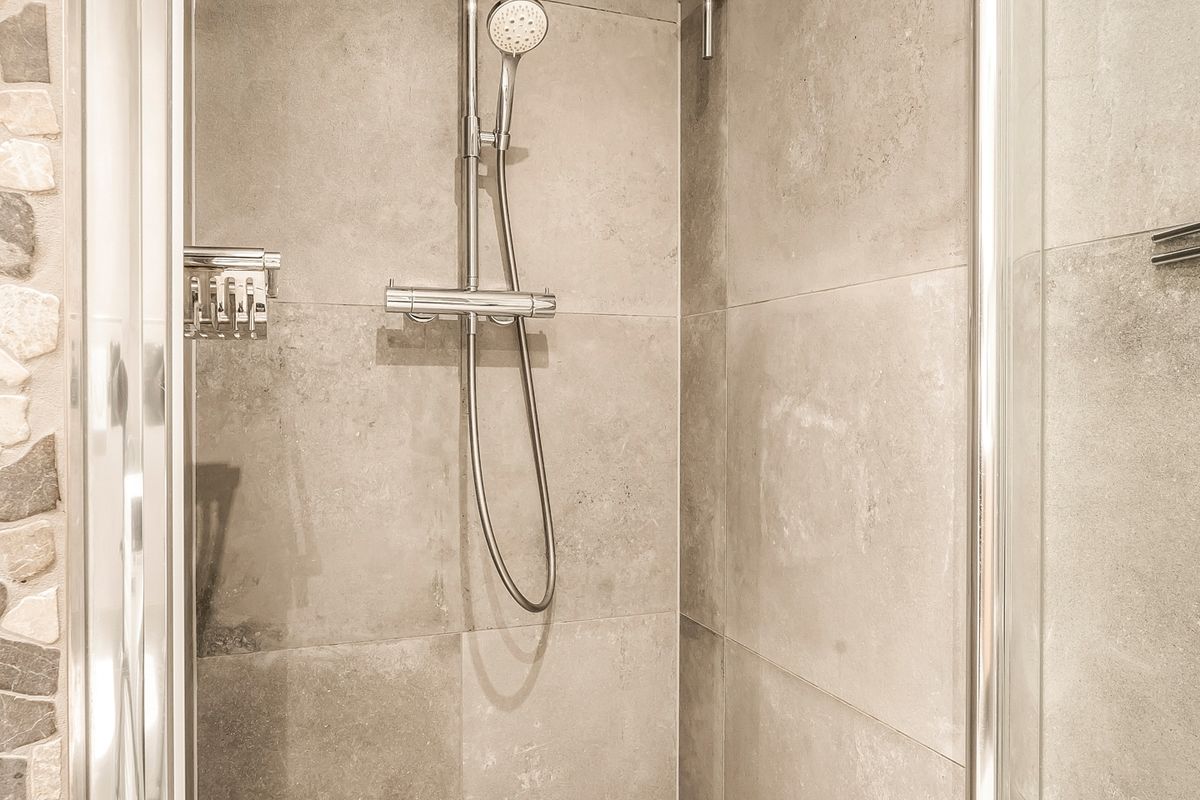 De badkamer heeft een moderne uitstraling dankzij grote betonlooktegels en een stijlvolle mozaïekwand. Hier vind je een inloopdouche met regendouche, wastafelmeubel en toilet. Ook zijn er aansluitingen voor wasmachine en droger aanwezig.