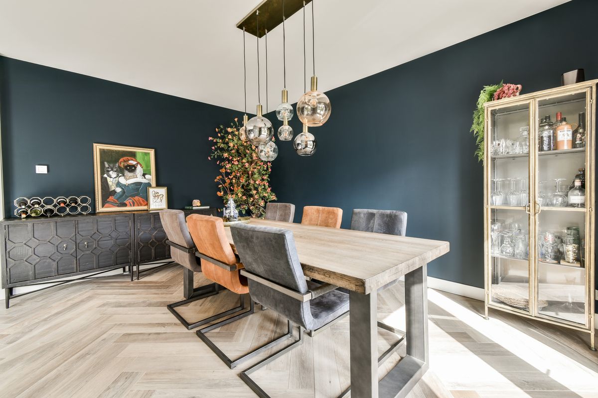 De woonkamer met aangrenzende eetkamer biedt volop ruimte voor het hele gezin en is stijlvol afgewerkt. De vloer met visgraatmotief en geïntegreerde vloerverwarming én -koeling geeft een luxueuze uitstraling én comfort. En voorzien van dubbele deuren naar de tuin.