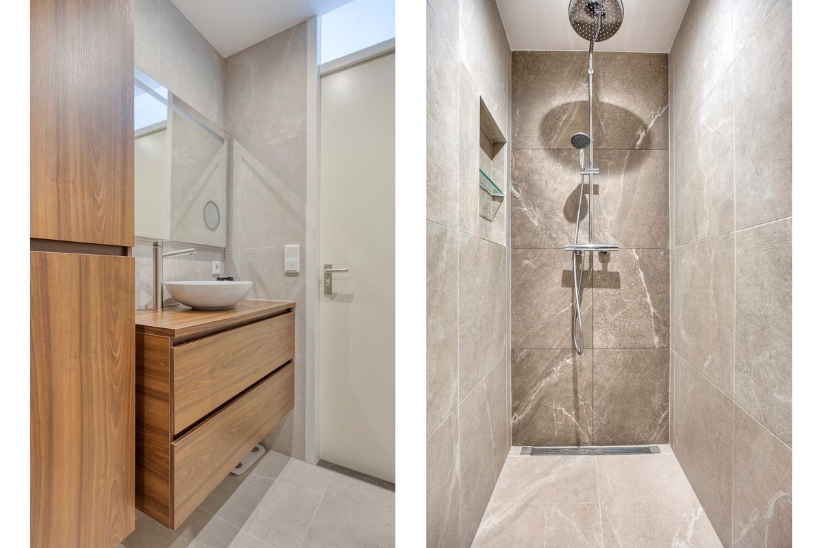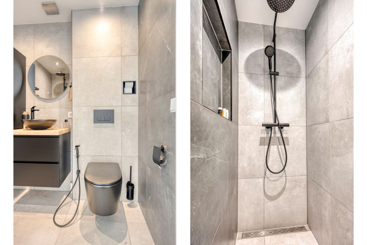 Het appartement beschikt over twee recent vernieuwde badkamers (2023), beide stijlvol afgewerkt met moderne tegels, luxe inloopdouches, strak vormgegeven wastafelmeubels en beide voorzien van een toilet met bidet functie; de andere is en suite bij de master bedroom.