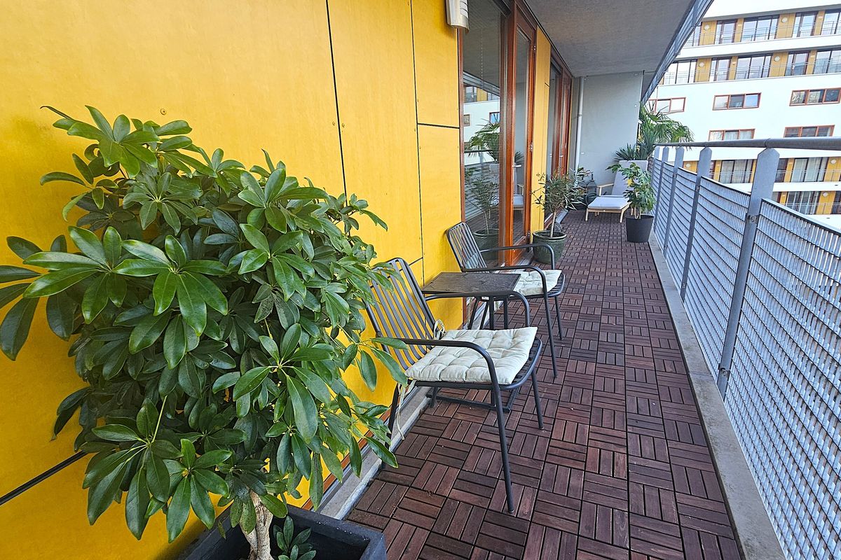 The apartment features one spacious bedroom with a stylish wardrobe and a separate office/study, ideal for those working from home or having guests. Both rooms open onto the balcony, allowing you to enjoy the view and fresh air from there as well.