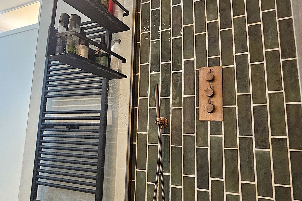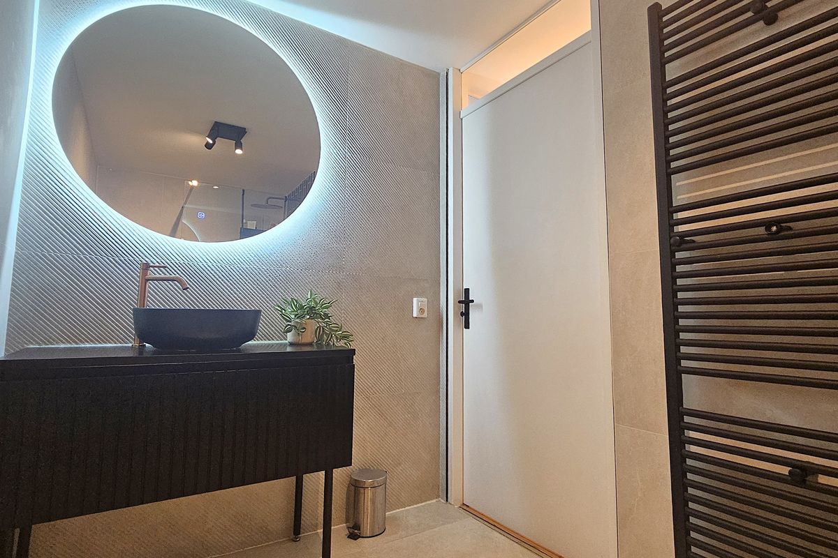 De luxe badkamer straalt rust en kwaliteit uit, voorzien van een ruime inloop regendouche en een strak vormgegeven wastafelmeubel. Daarnaast is er een separaat toilet en een aparte wasruimte met wasmachine en droger.