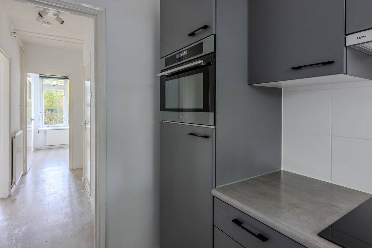 De keuken is gelegen aan de voorzijde en in 2021 vernieuwd, voorzien van moderne apparatuur en een nette afwerking. Vanuit de hal bereik je ook de woonkamer, gesitueerd aan de achterzijde van het complex. De woonkamer biedt een groen uitzicht en voelt licht en ruim aan.