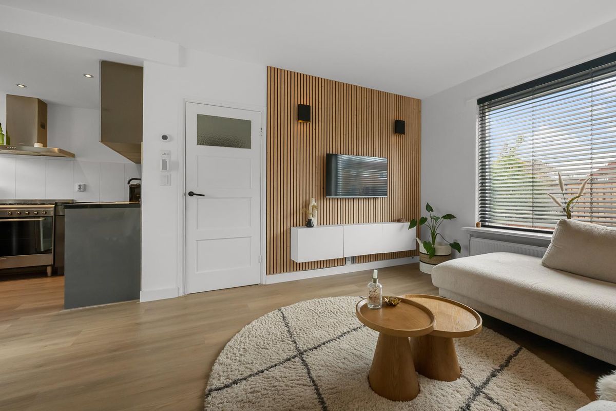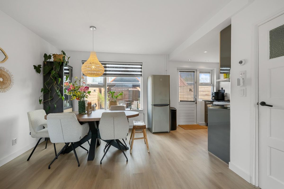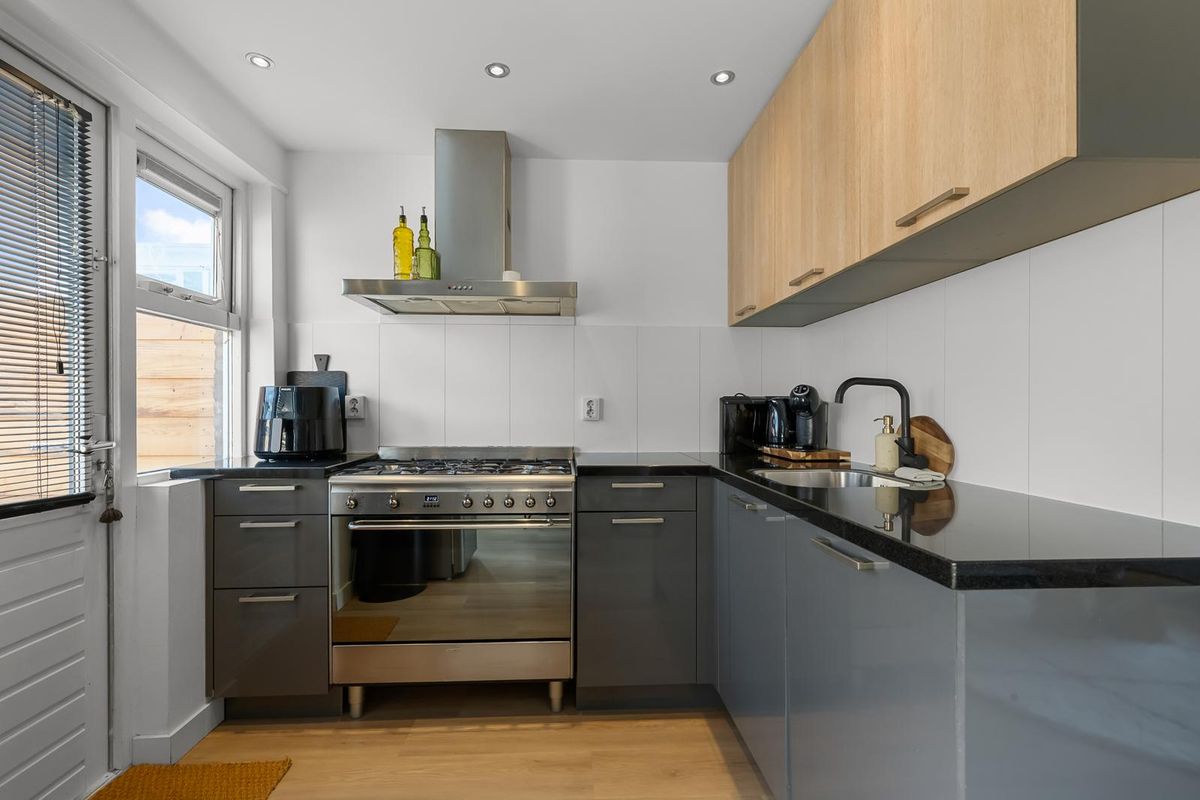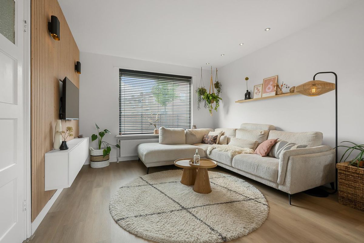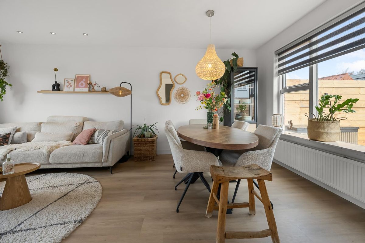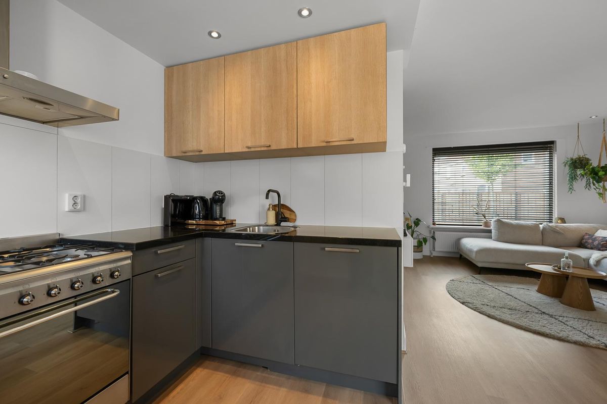De woonkamer is een prettige, lichte ruimte met grote ramen aan voor- en achterzijde. Er ligt een PVC-vloer (houtlook) die de hele begane grond een warme uitstraling geeft. De open keuken is afgewerkt met een zwart granieten blad en voorzien van diverse apparatuur: koelkast, combimagnetron, vaatwasser, 5-pits gaskookplaat en een oven.
