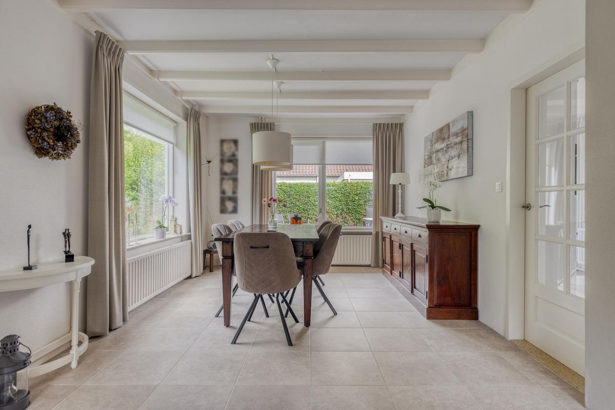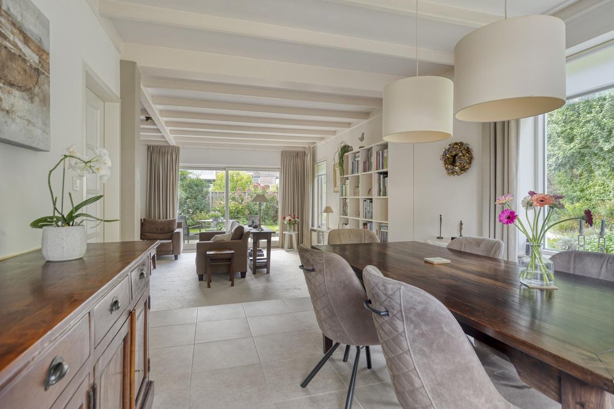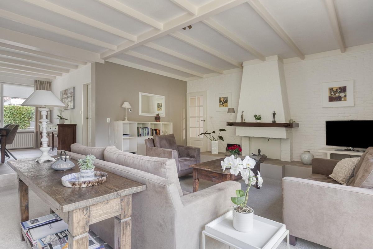 De witte houten balken aan het plafond geven de ruimte een warme, huiselijke sfeer.