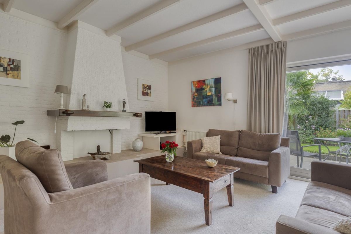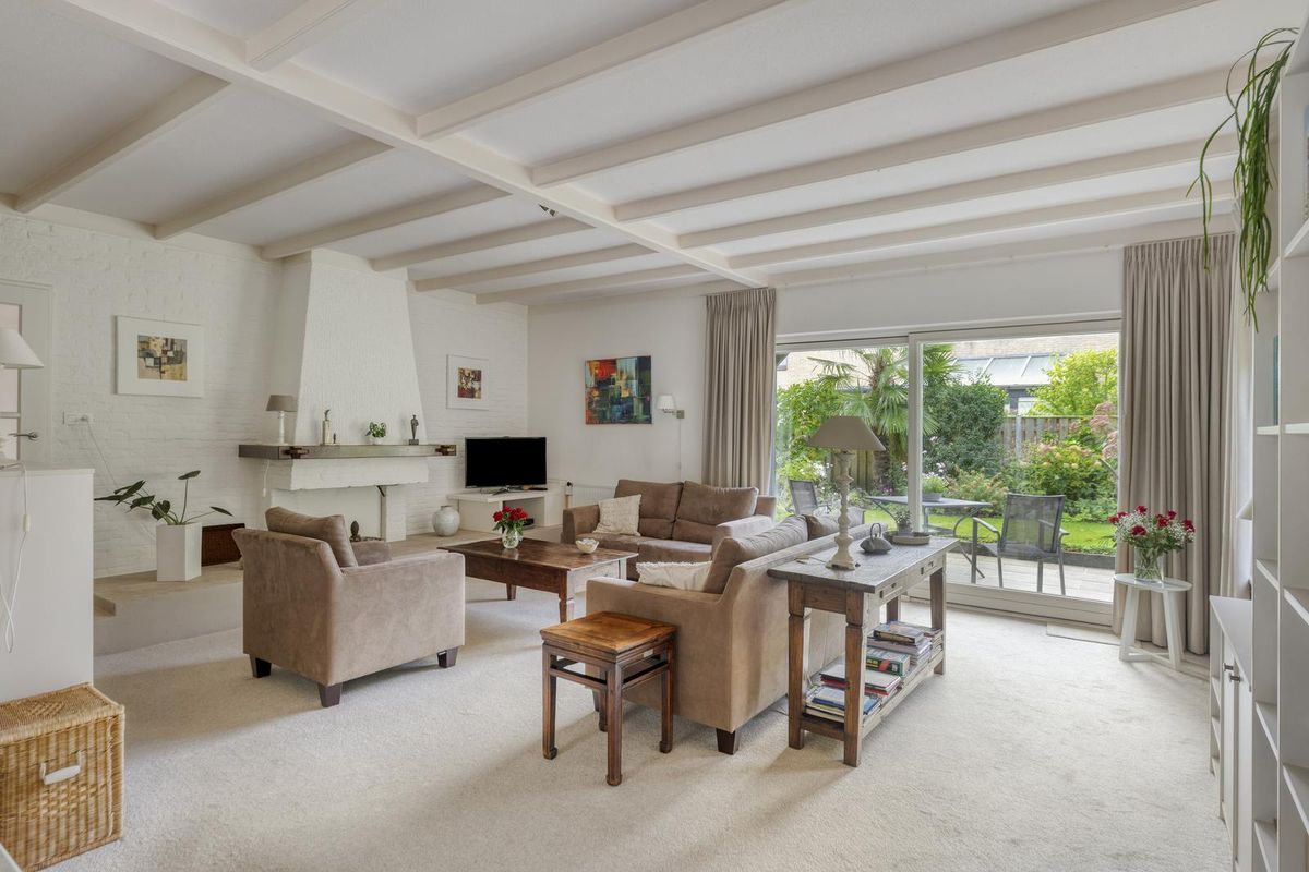 De woonkamer is een heerlijke leefruimte met aan beide zijden grote raampartijen, waardoor het daglicht rijkelijk binnenvalt.