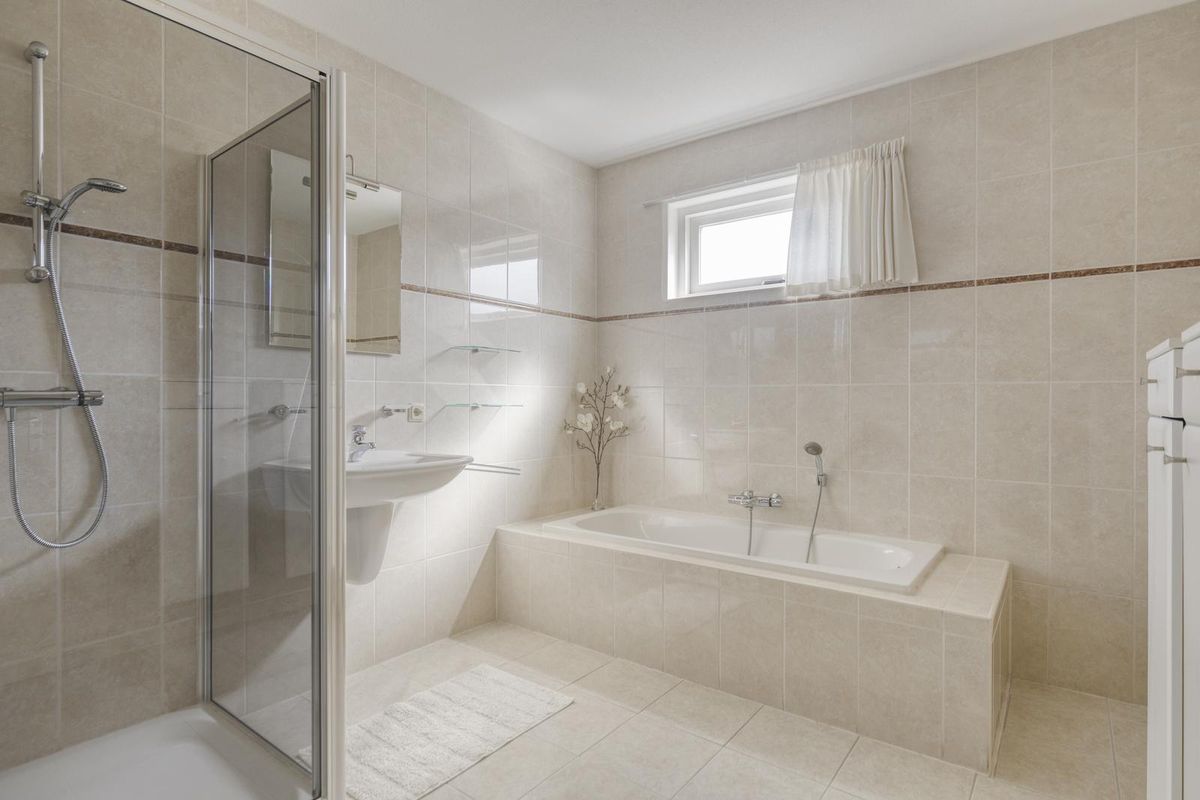 De slaapkamer op de begane grond is voorzien van een eigen badkamer (ook via de hal toegankelijk) en beschikt over een ligbad, douche en wastafel.