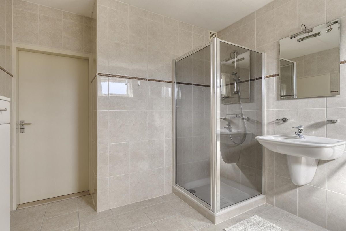 De tweede badkamer is ruim opgezet en voorzien van een inloopdouche, wastafel en toilet.