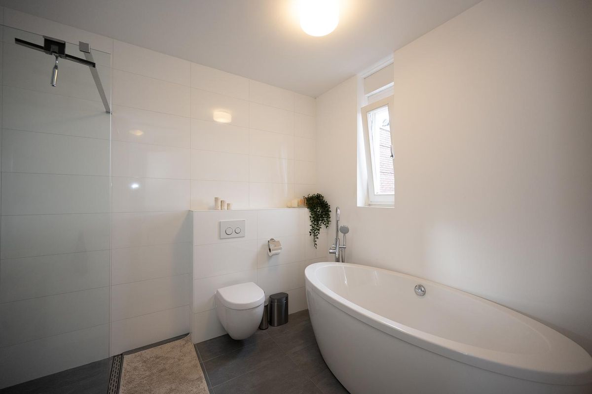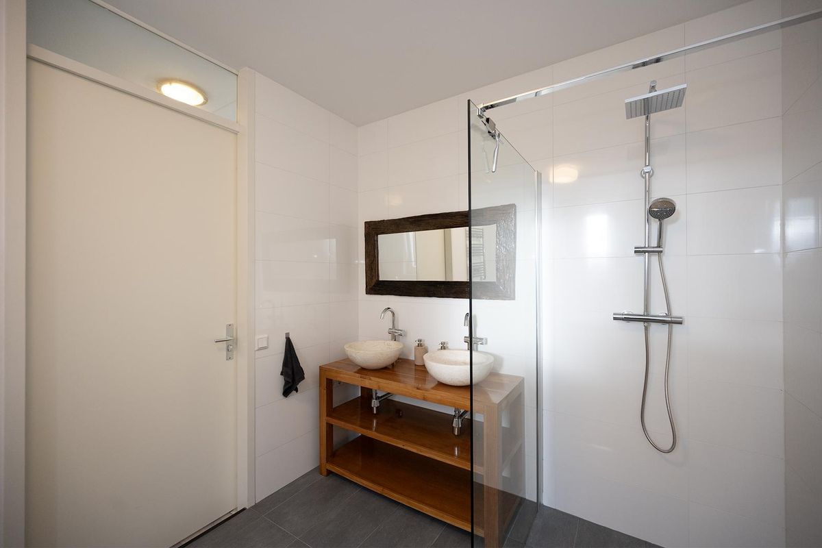 Overloop met toegang tot de slaapkamer, voorzien van een tweepersoonsbed en kledingkast. De moderne badkamer is voorzien van een inloopdouche, ligbad, tweede toilet en badkamermeubel.