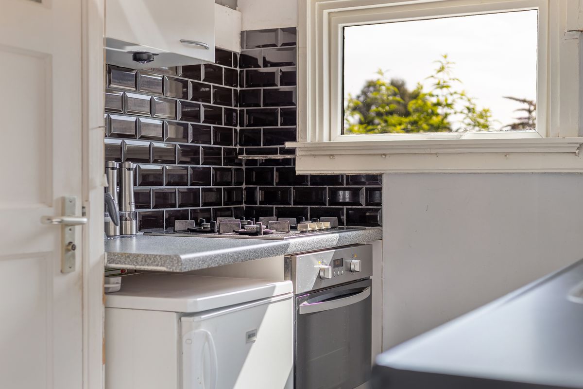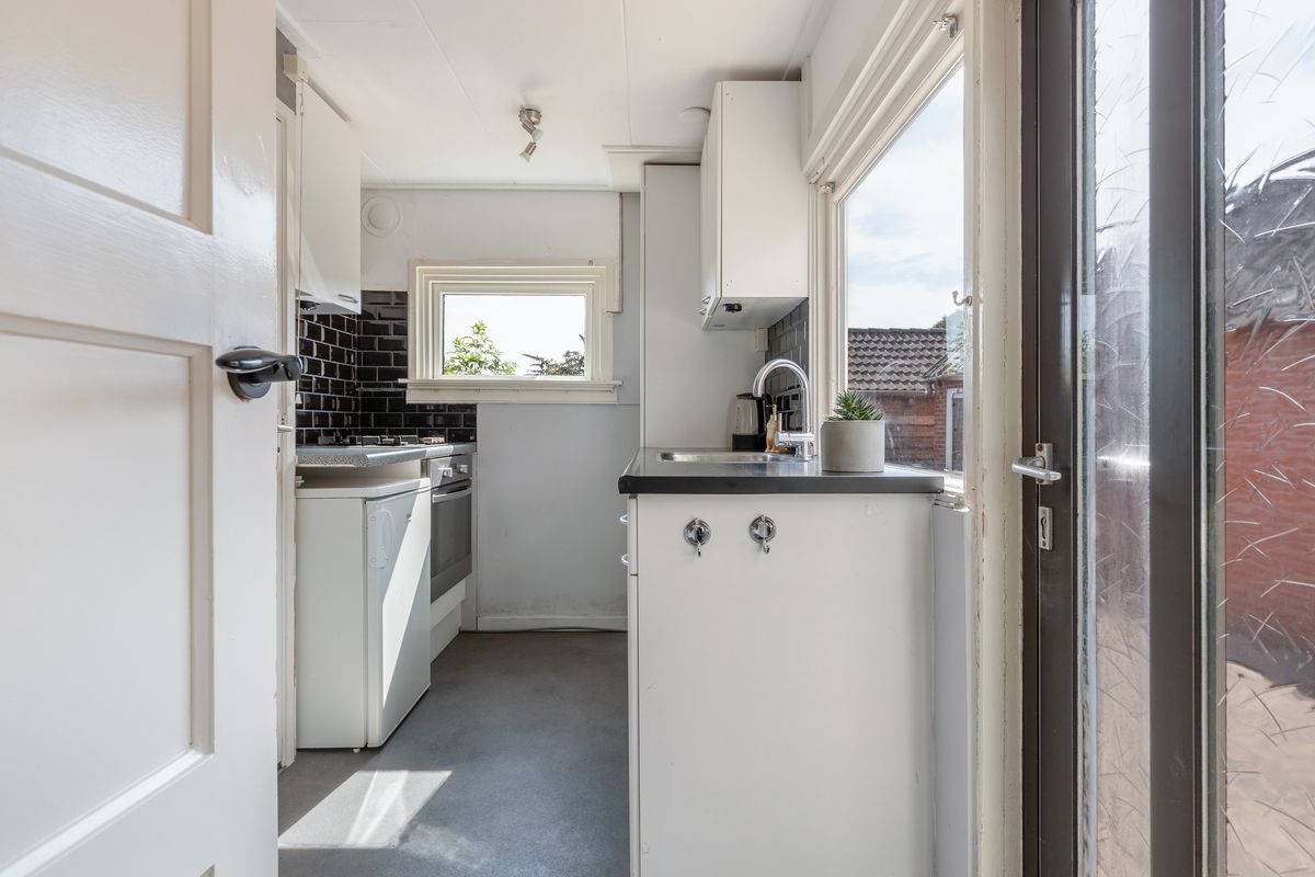 Entree/hal, L-vormige woonkamer met vaste kast, kelder, dichte keuken met keukenblok v.v. enig inbouwapparatuur en achterdeur, badkamer v.v. staand toilet, badmeubel en douchecabine.