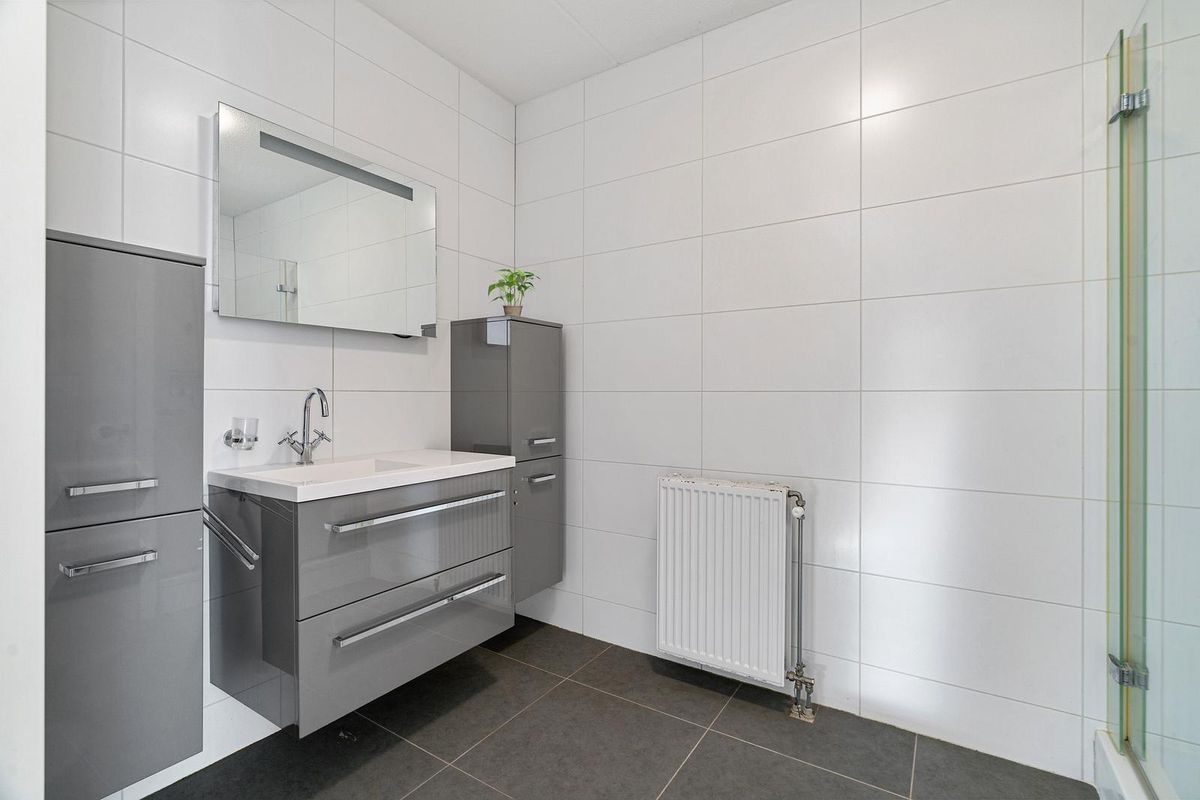 Via een tweede hal bereikt u de badkamer, slaapkamer, garage en de achtertuin. De slaapkamer op de begane grond geniet van veel licht en een prettig uitzicht op de tuin. De badkamer is volledig betegeld en voorzien van een douche met glazen wand, tweede toilet en modern wastafelmeubel.