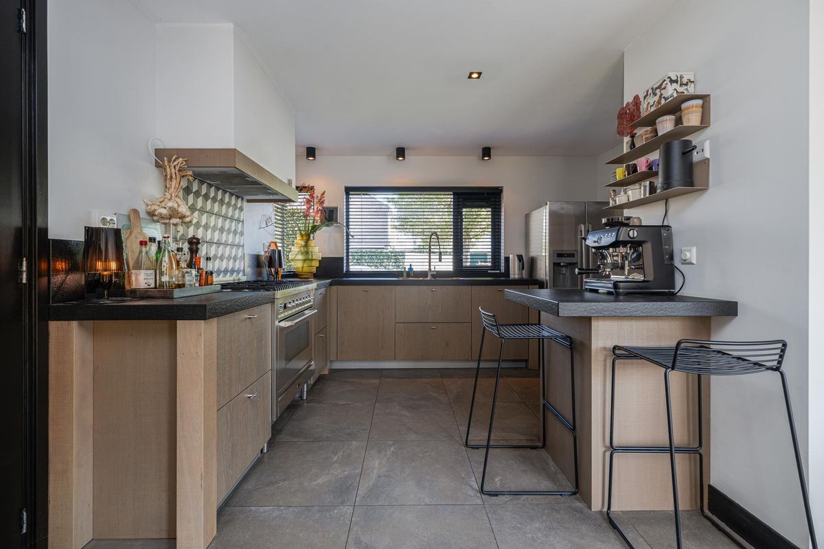 De halfopen keuken, gelegen aan de voorzijde van de woning, is modern ingericht en voorzien van diverse inbouwapparatuur, waaronder een kookplaat, oven, afzuigkap en vaatwasser. In de aangrenzende bijkeuken is ruimte voor de wasmachine en droger.