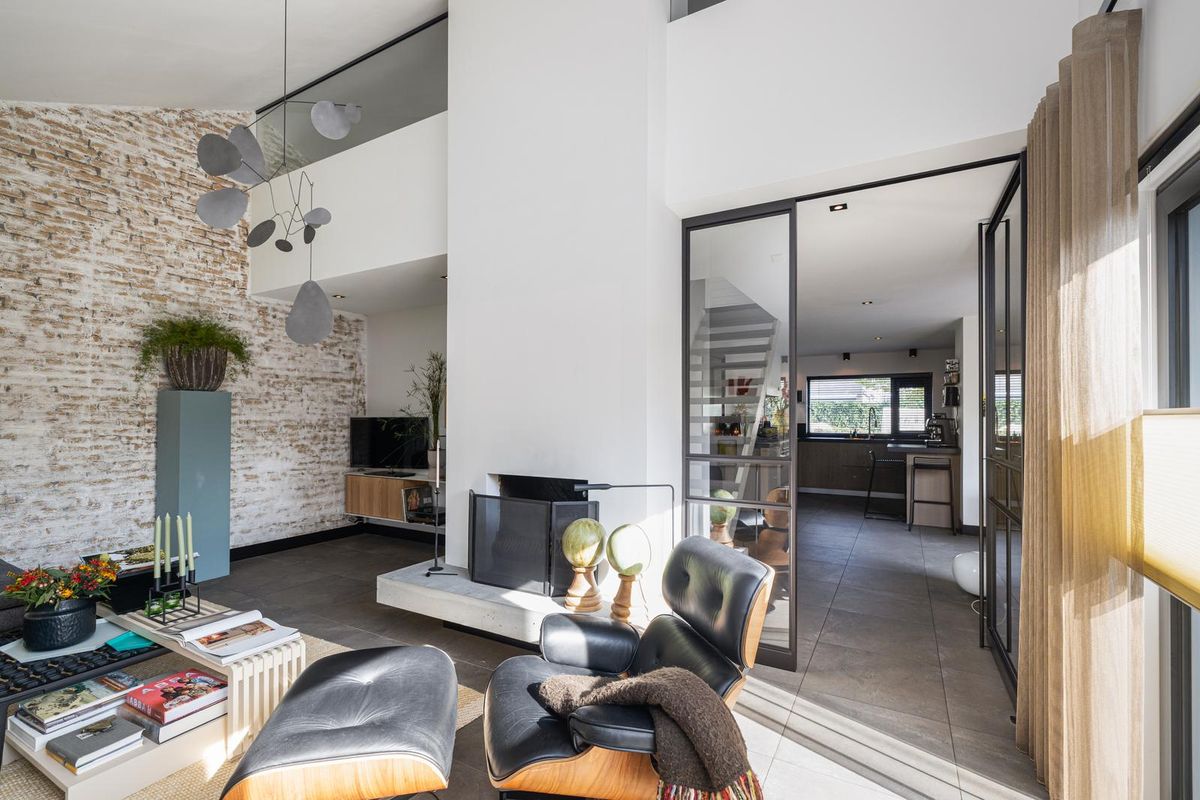 Het toilet is deels betegeld en voorzien van een hangend toilet, een fonteintje en een ingebouwde muurnis voor accessoires of decoratie. Vanuit de gang is er toegang tot het woon-/eetkamergedeelte. De begane grond is luxe en ruimtelijk te noemen. De royale living aan de achterzijde van de woning is voorzien van een open haard, strak gestuukte muren, een moderne inrichting met houten wandpanelen en zwarte stalen deuren. Dit zorgt samen voor een warme en eigentijdse sfeer. Vanuit dit gedeelte is er middels een schuifpui met hor toegang tot de achtertuin. Mede vanwege de glaspartij is er een fijne connectie met de 1e verdieping.