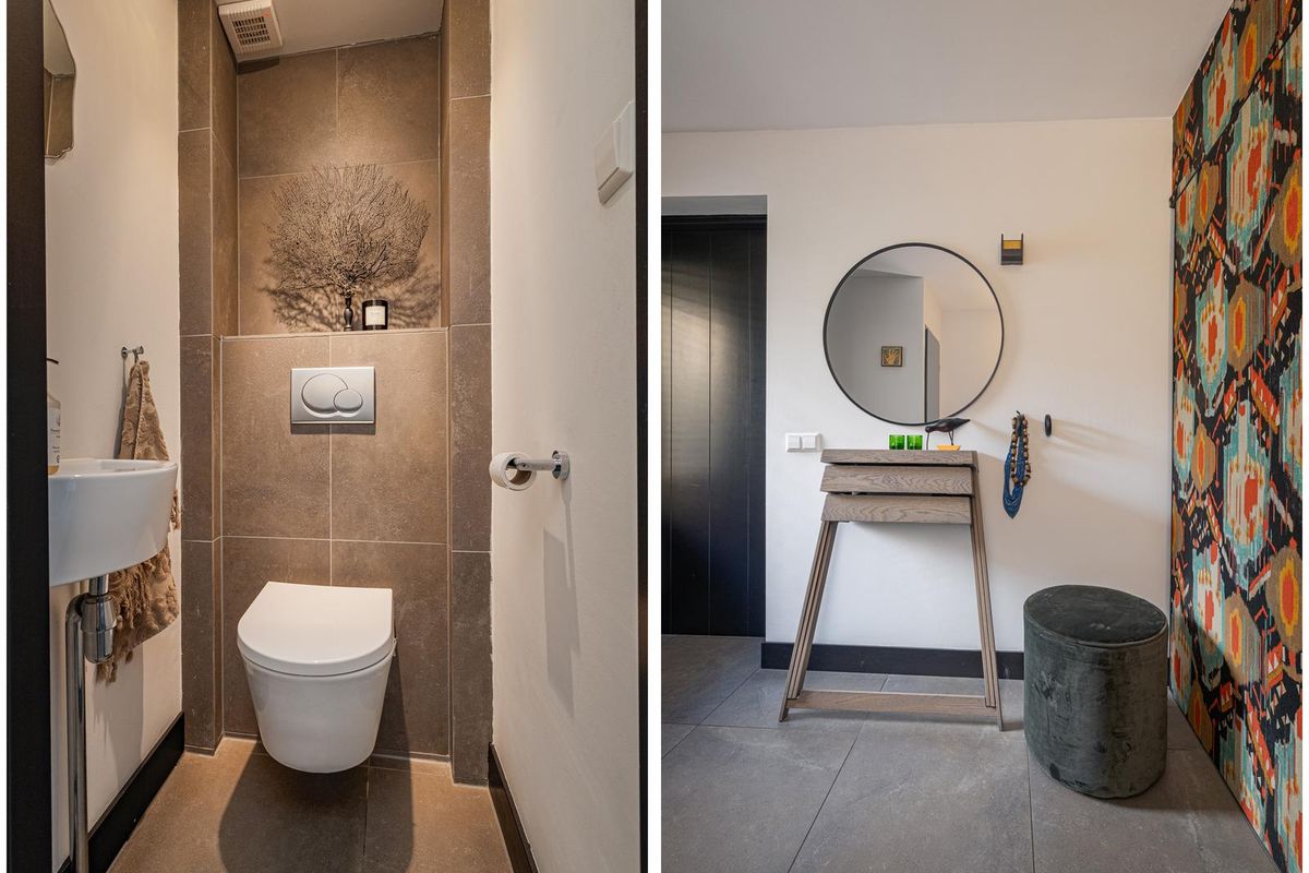 De luxe badkamer is uitgevoerd met een 2e toilet, wastafelmeubel, inloopdouche en is volledig betegeld in een moderne stijl.