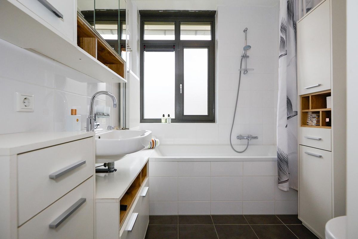 Overloop met 2 slaapkamers aan de achterzijde van de woning en een derde slaapkamer en de badkamer, uitgerust met ligbad, wastafel met meubel en een tweede toilet de voorzijde.