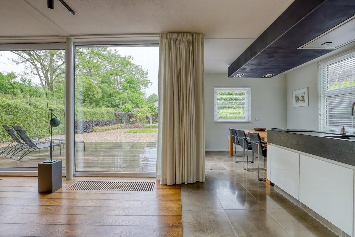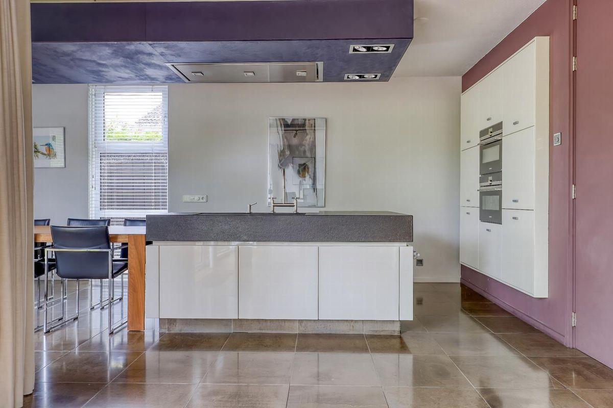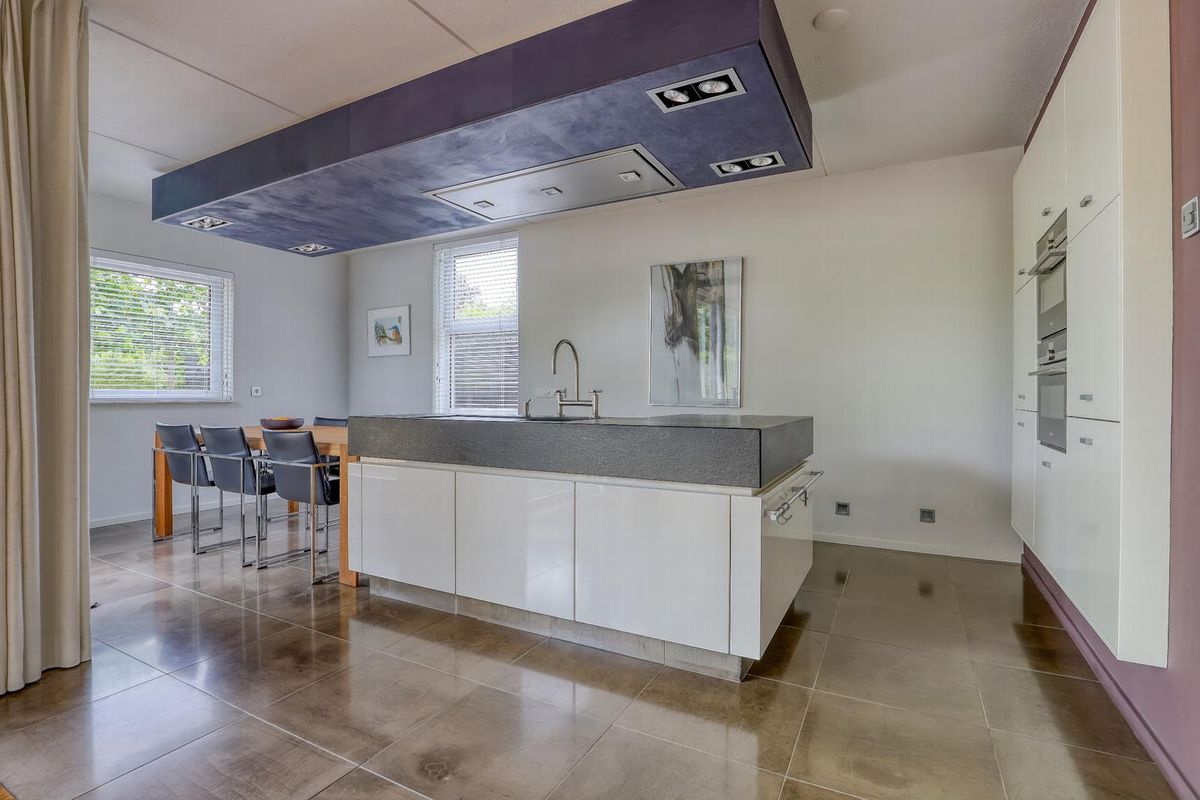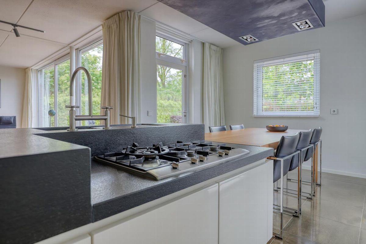 Via de overdekte entree betreedt u de hal met trapopgang en het moderne toilet met fonteintje. Aan de linkerzijde van de woning ligt de sfeervolle woonkamer, ingericht met een moderne brede 'dancing flame' gas gestookte open haard, om de hoek aan de achterzijde is de open verbinding naar de keuken. Dankzij de grote raampartijen is er veel daglicht en verbinding met de tuin! De keuken is modern vormgegeven en voorzien van een strak kookeiland met geïntegreerde spoelbak, gaskookplaat en afzuigkap. In de kastenwand zijn een combi oven/magnetron, oven/stoomoven en koelkast keurig weggewerkt, en ook de vaatwasser ontbreekt niet. De keuken biedt bovendien veel werkruimte. De eettafel vormt een stijlvol verlengde van het kookeiland, waardoor koken en tafelen op natuurlijke wijze in elkaar overlopen. Dankzij de schuifpui en keukendeur staan de woonkamer en keuken in direct contact met het terras. Op de begane grond vindt u verder een royale bijkeuken/garage met veel praktische opbergruimte. Hier bevinden zich ook de aansluitingen voor wasmachine en droger, evenals de cv-installatie.