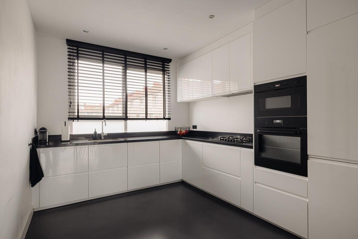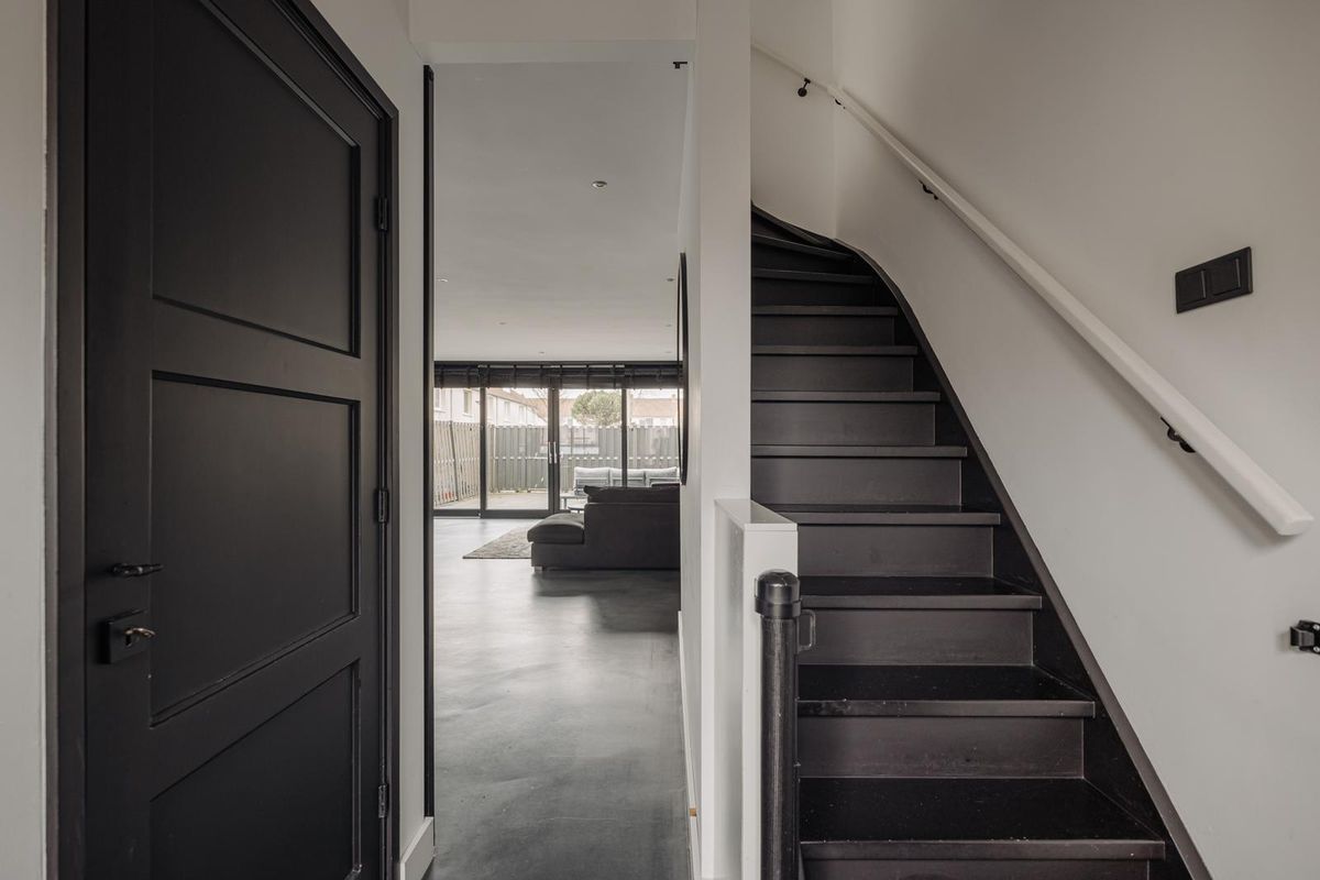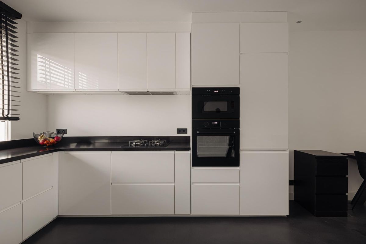 Voortuin van 5,52 m x 2,70 m, entree, toiletruimte, meterkast en trapopgang naar de verdieping. Woonkamer met moderne open keuken (2019), voorzien van alle inbouwapparatuur, vloerverwarming en een dubbele schuifpui naar de zonnige tuin op het westen (6,63 m diep en 6,06 m breed).