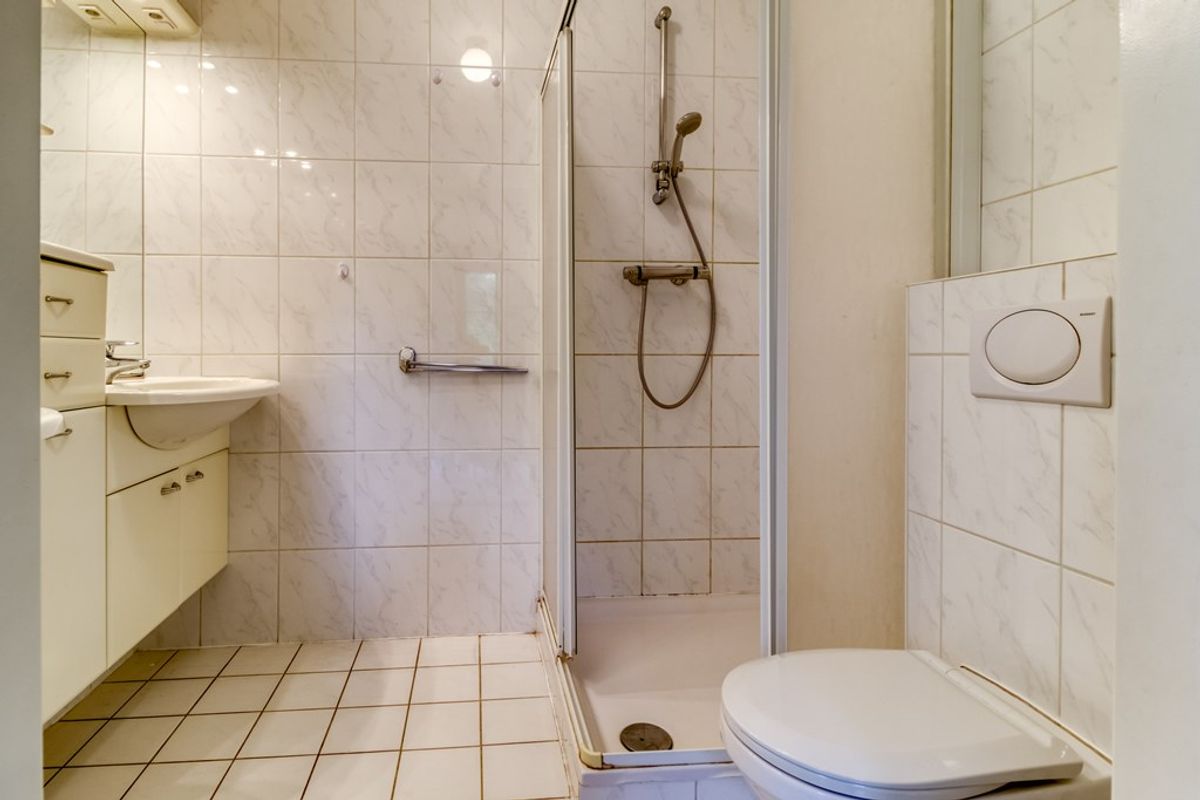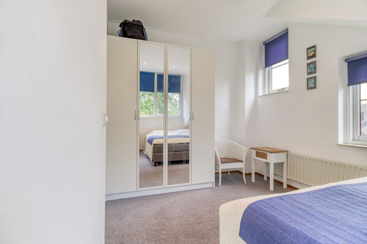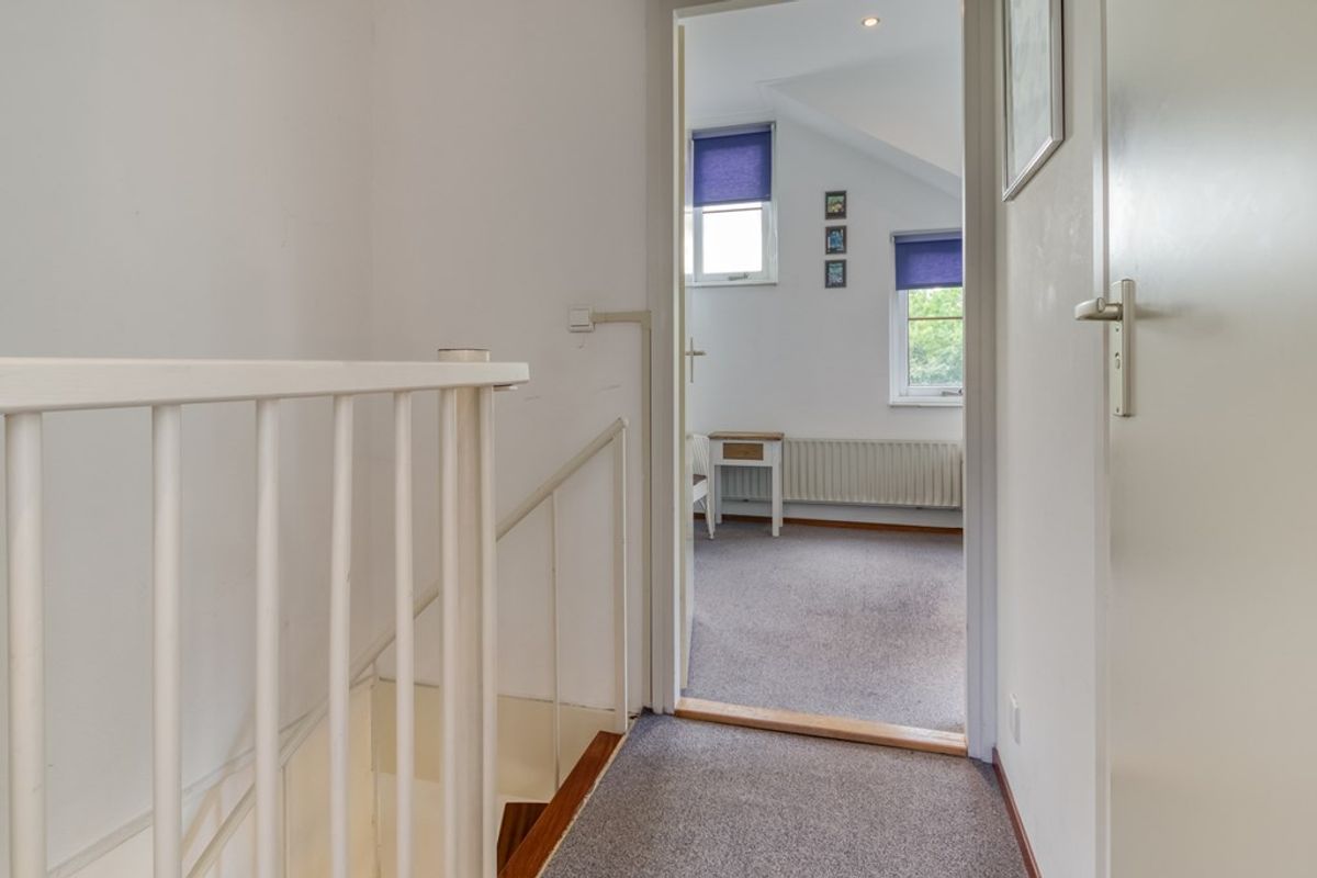 Overloop met toegang tot twee slaapkamers en de toiletruimte met wastafel, toilet, wasmachine en droger. Door de dakkapel over de volledige breedte is er veel extra ruimte ontstaan.